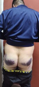 Luego los desnudaron y les sujetaron las manos por las espalda con precintos. Los colocaron boca abajo con la cara contra el piso, encimados unos con otros. Allí los efectivos policiales continuaron golpeando y amenazando de muerte a los detenidos. Llegaron incluso a apoyar y frotar la tonfa en las partes íntimas de los detenidos, los amenazaron con accederlos sexualmente con ella y los obligaron a que se besaran entre sí sus partes íntimas, incluso a un detenido que se había defecado producto de los golpes.