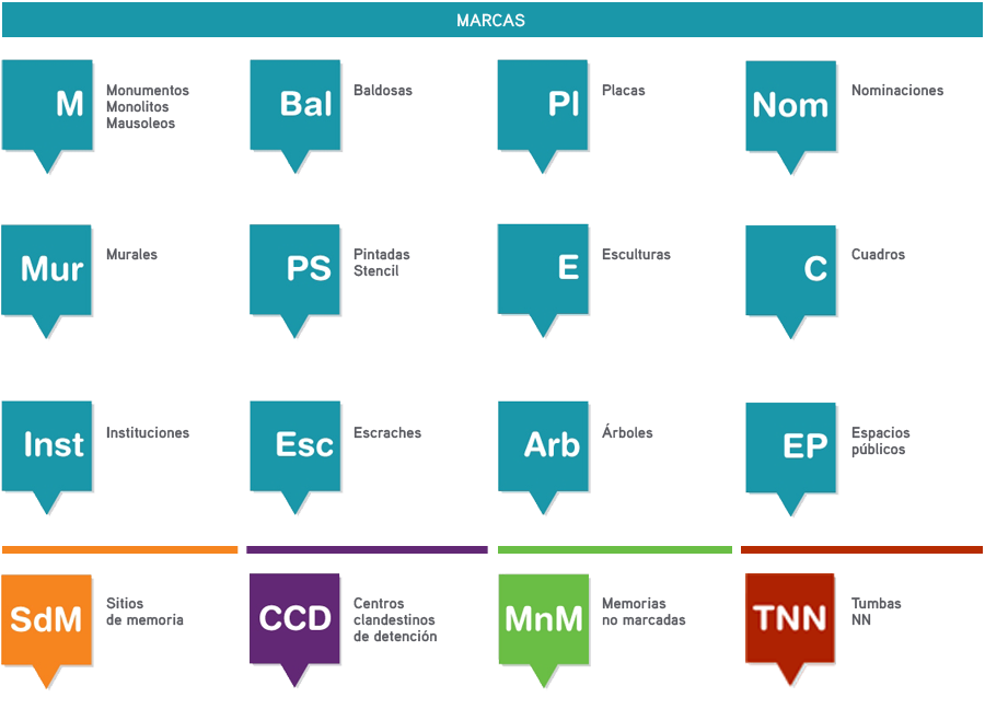 Parte de la información disponible es a partir del aporte de las distintas instituciones y organismos como también de los grupos de estudiantes, de jóvenes, de militantes políticos y sociales. También hemos intentado dar prioridad en la sistematización de información y análisis sobre aquellas marcas y señalamientos que no se encuentran analizadas en otros trabajos de investigación: como por ejemplo, las marcaciones realizadas desde organizaciones gremiales, o en lugares periféricos de las ciudades. Y hemos dejado de lado profundizar el análisis en algunas marcas que sí han sido abordadas en otras instituciones e investigaciones vinculadas al tema, como por ejemplo sobre sitios de memoria o ex centros clandestinos de detención.