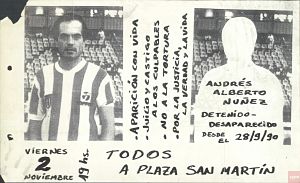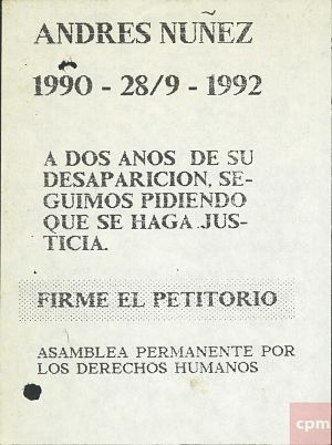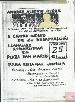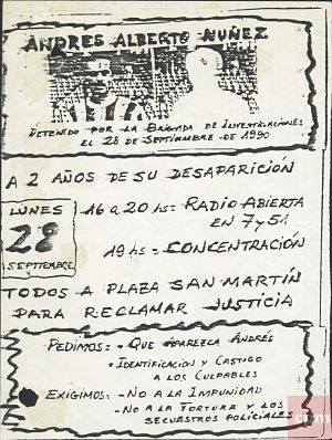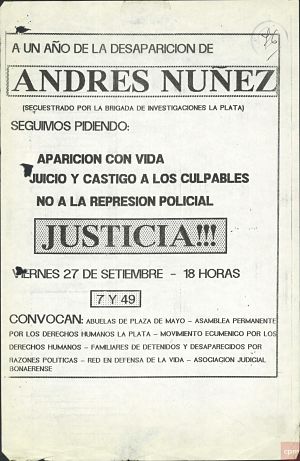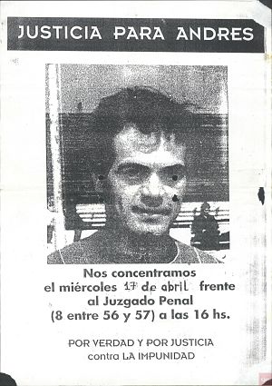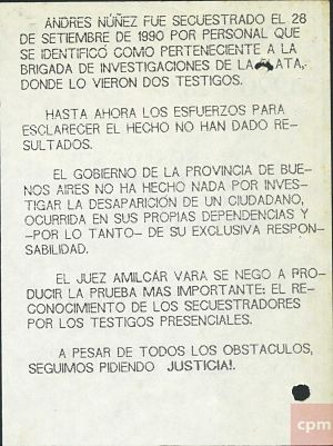 Andrés Núñez tenía 32 años cuando, el 28 de septiembre de 1990, fue secuestrado en su casa de Villa Elvira por un grupo de policías que lo redujeron y trasladaron a la Brigada de Investigaciones de La Plata, donde fue sometido a torturas y asesinado. Durante cinco años, la familia no pudo hallar sus restos, hasta que uno de los policías implicados confesó que lo habían enterrado en un campo de la localidad de General Belgrano.