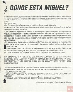 La familia de Miguel junto las organizaciones políticas, sociales y culturales continúan exigiendo la aparición del cuerpo de Miguel, y la investigación penal al resto de los policías que estuvieron presentes en la comisaría 9ª la noche del crimen.