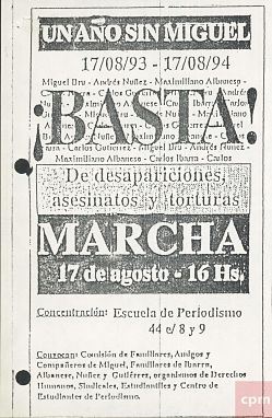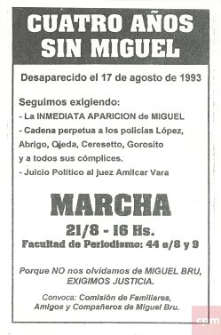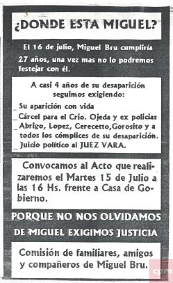 El 17 de agosto de 1993 desapareció Miguel Bru. Tenía 23 años, y estudiaba Periodismo en la Universidad. A través de testigos y diferentes pruebas surgidas en la búsqueda que iniciaron sus familiares y amigos se comprobó que fue secuestrado por personal policial y llevado a la Comisaría 9ª de La Plata, ubicada en 5 y 59, donde fue sometido a torturas que lo llevaron a la muerte.