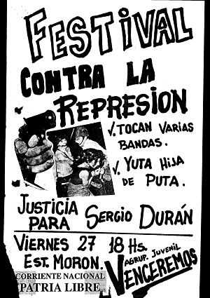 Sergio Durán tenía 17 años cuando fue detenido por averiguación de antecedentes por la policía, que lo llevó a la comisaría 1ª de Morón el 6 de agosto de 1992. Privado ilegalmente de su libertad, Sergio fue torturado por más de seis horas y falleció más tarde en el hospital de Morón. Por el asesinato sólo fue detenido el subinspector Jorge Ramón Fernández, quien en el primer juicio en 1995 fue condenado a cadena perpetua. El resto de los acusados, el subcomisario Miguel Ángel Rojido, oficial Luis Alberto Farese, cabo Hugo Nicolosi y cabo Raúl Rodolfo Gastelú se dieron a la fuga. En 2003, once años después de los hechos, se llevó adelante el segundo juicio oral contra tres de los asesinos: Nicolosi, Rojido y Gastelú. El primero fue condenado a cadena perpetua mientras los últimos dos no se presentaron al juicio.