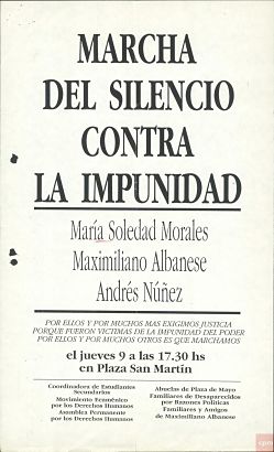 Maximiliano Albanese fue asesinado el 3 de junio de 1990, tenía 17 años. Estaba sentado con otros dos amigos en el cordón de la vereda esperando para entrar a bailar en el Centro de Estudiantes de Chubut en La Plata, cuando se acercaron tres hombres –el policía Héctor Oscar Ferrero, y los civiles Fabián Guillermo Nievas y Carlos José Navarro-y le pidieron los documentos. Ferrero lo llevó casi ochenta metros a golpes y le disparó en la cabeza. Maximiliano murió dos horas después.