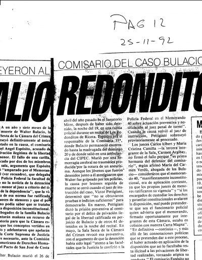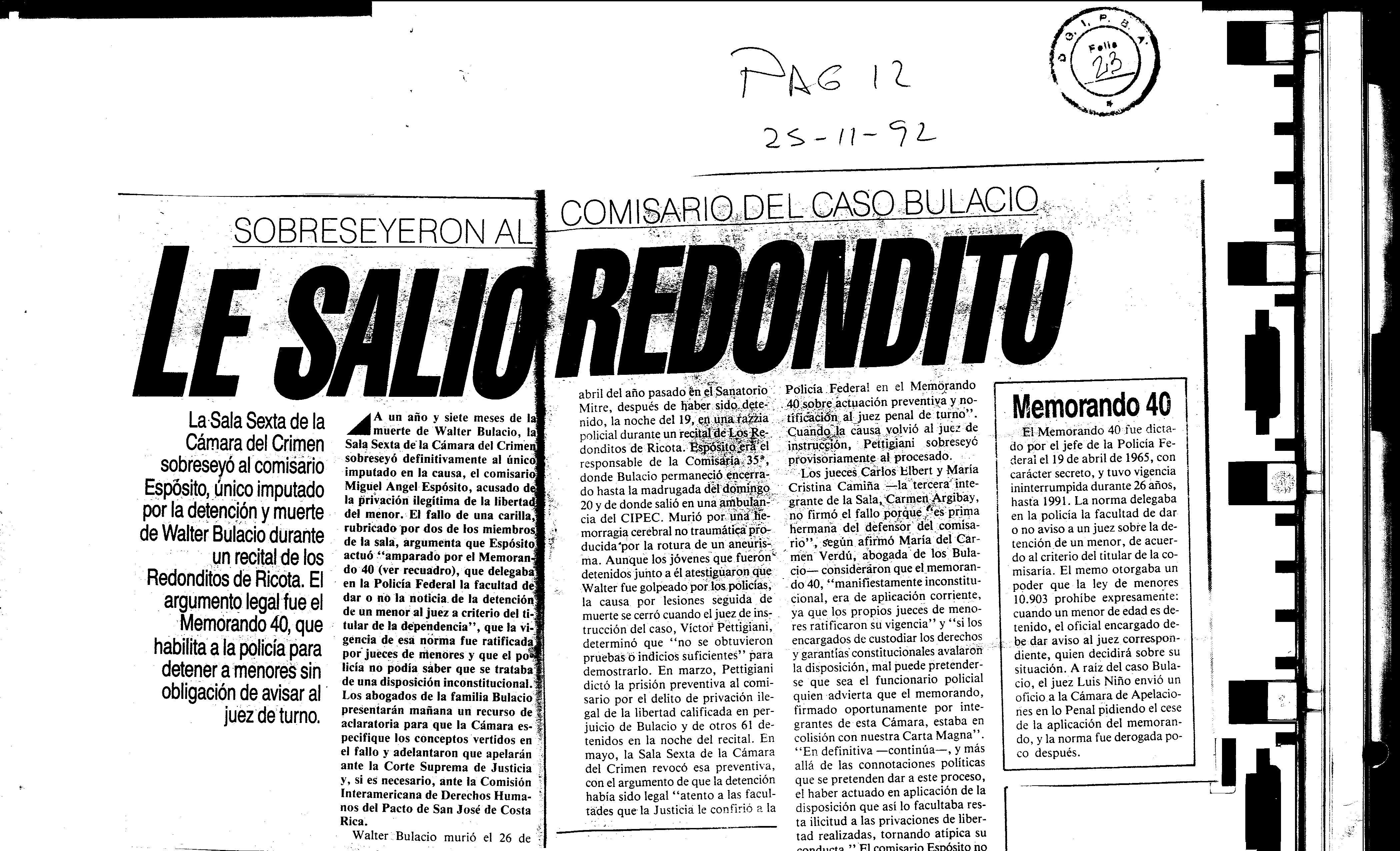 El 19 de abril de 1991 la policía detuvo a Walter Bulacio en una razzia policial en las afueras del recital de Patricio Rey y los redonditos de ricota en el estadio Obras Sanitarias. No era el único, cientos de jóvenes que se encontraban en las puertas del estadio fueron interceptados por la policía; 73 de ellos fueron llevados a la comisaría 35ª de la Policía Federal, a cargo del comisario Miguel Ángel Espósito.