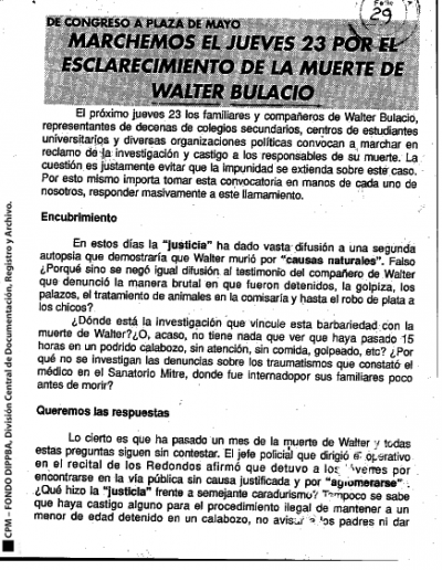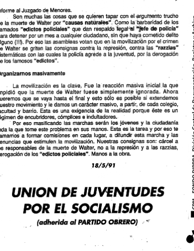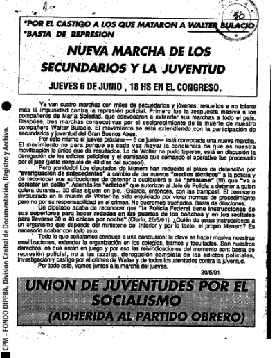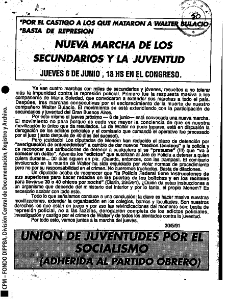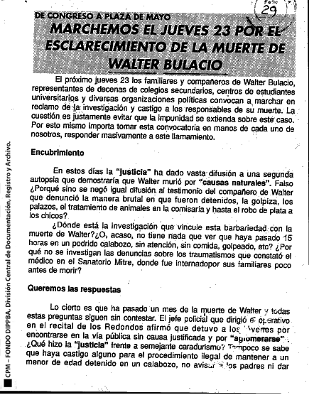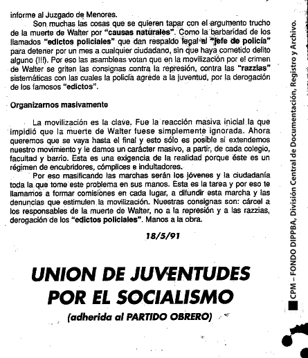 La muerte de Walter y los reclamos por justicia no pasaron desapercibidos para la Dirección de Inteligencia de la Policía de la Provincia de Buenos Aires (DIPPBA), la cual desplegó una pormenorizada vigilancia sobre las luchas y movilizaciones posteriores, fundamentalmente aquellas impulsadas por los más jóvenes. Marchas, «sentadas» en los colegios y universidades, volanteadas y manifestaciones en las calles, fueron organizadas por una juventud que en los años 90 sufría la estigmatización, la persecución y la violencia del Estado.