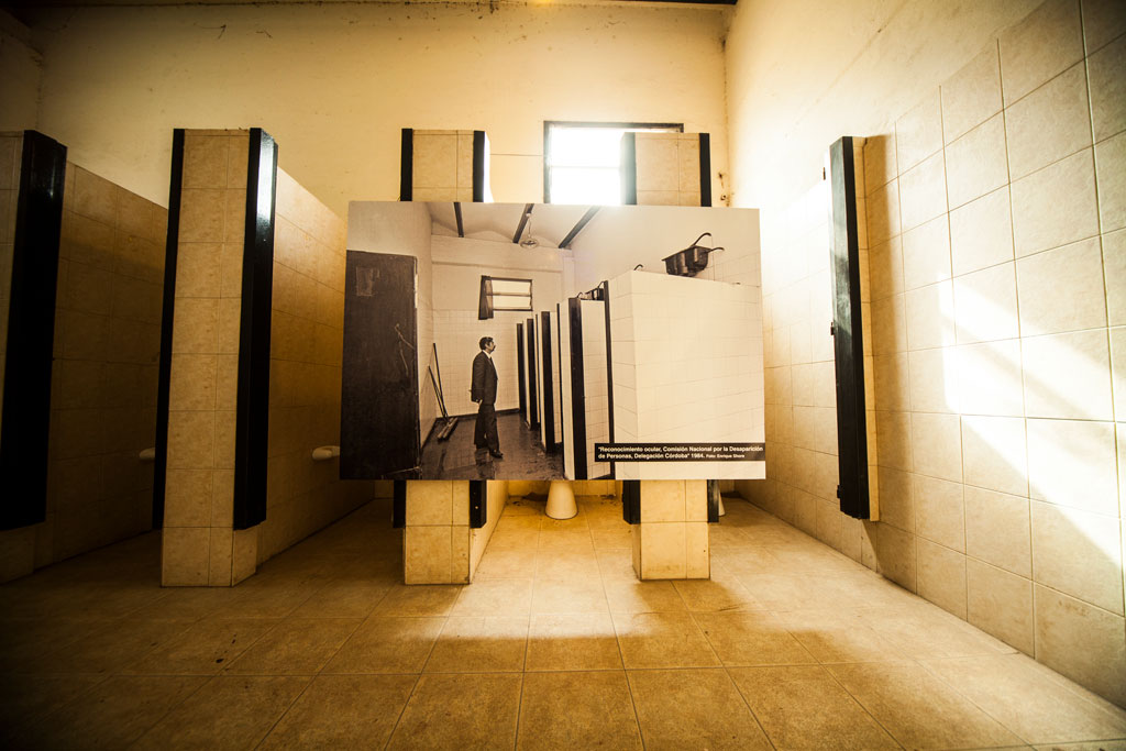 Intervención en el baño del ex CCD La Perla con una fotografía de Enrique Shore realizada durante las inspecciones de la CONADEP.