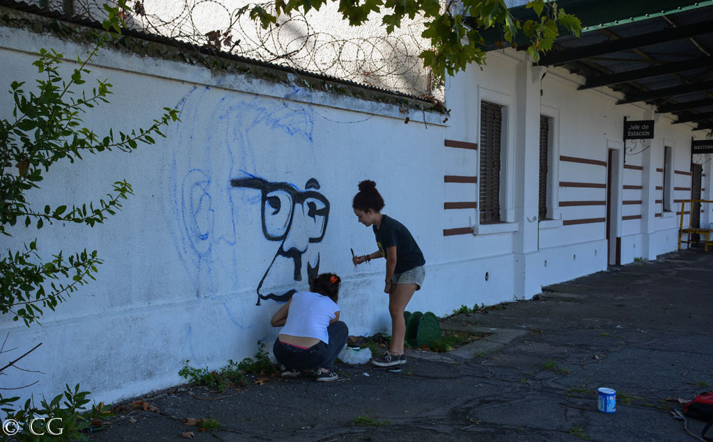 Mural en la estación de tren en homenaje al escritor detenido-desaparecido Rodolfo Walsh en el marco de la “Caminata por Walsh” en el barrio donde el escritor vivió y escribió la Carta Abierta a la Junta Militar en 1977.