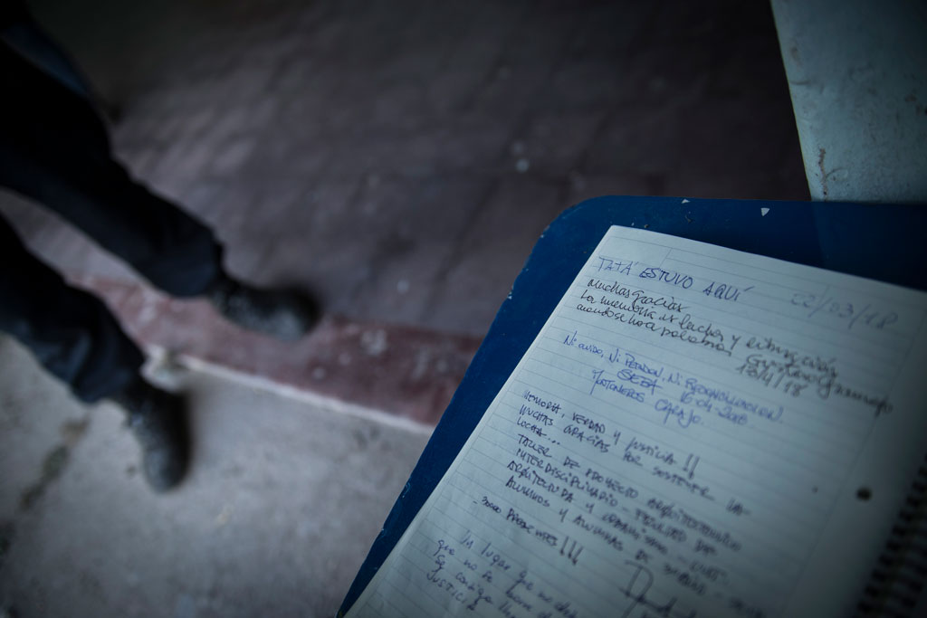 Nota dejada por un visitante al ex CCD “La escuelita de Famaillá” en el libro de visitas, en el fondo, las botas de un oficial de policía asignado al lugar. Ex CCD Escuelita de Famaillá, Tucumán.