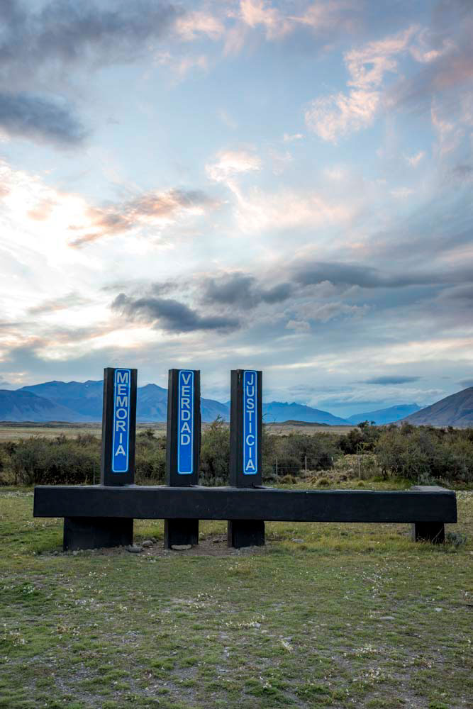 Señalización como sitio de memoria frente a la estancia La Anita, provincia de Santa Cruz, perteneciente a la familia Braun Menéndez-Behetty. Lugar donde fueron asesinados cientos de peones rurales en 1921.