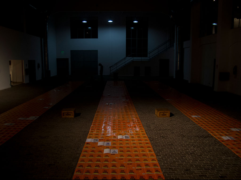 Intervención de Andrea Fasani evocando los 30000 desaparecidos con una instalación realizada con cuadernos Gloria fabricados por la empresa Ledesma.