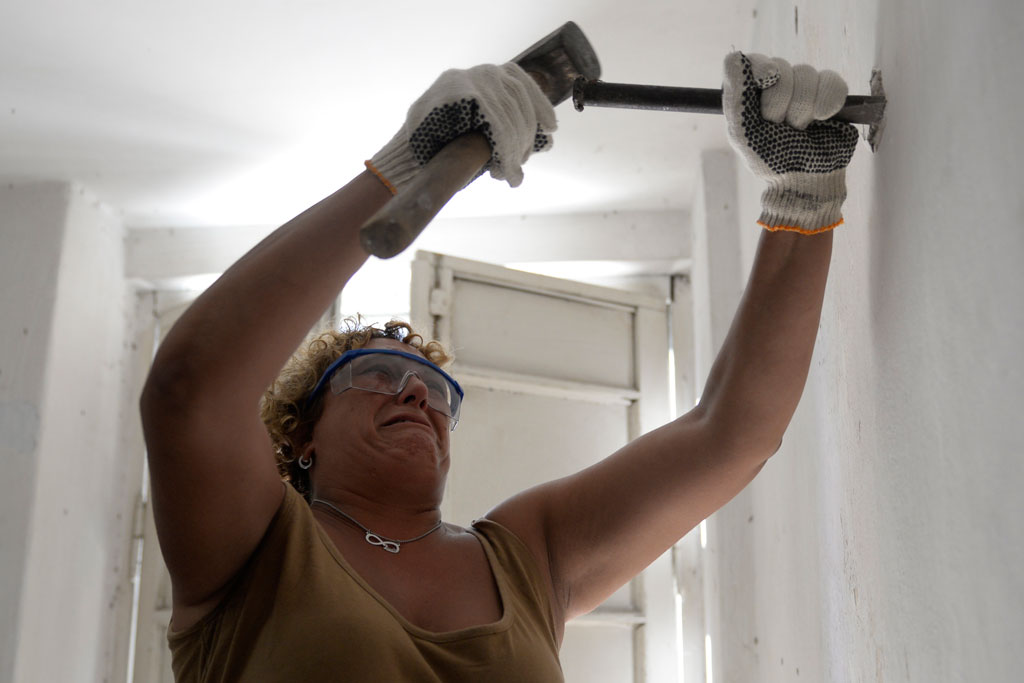 Paula Vanina Luna, hija de Daniel Gorosito, desaparecido el 28 de Octubre de 1976, demoliendo una de las paredes del ex CCD “El Pozo”, hoy Centro Popular de la Memoria. Acto simbólico de organismos de derechos humanos DDHH y del gobierno de Santa Fe.