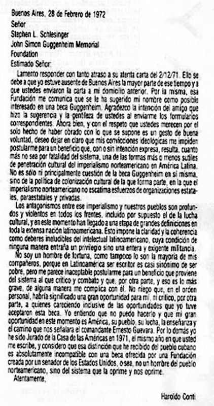 A raíz del compromiso político y cultural que asumió en esa época, en 1972 Haroldo Conti rechazó la beca Guggenheim: