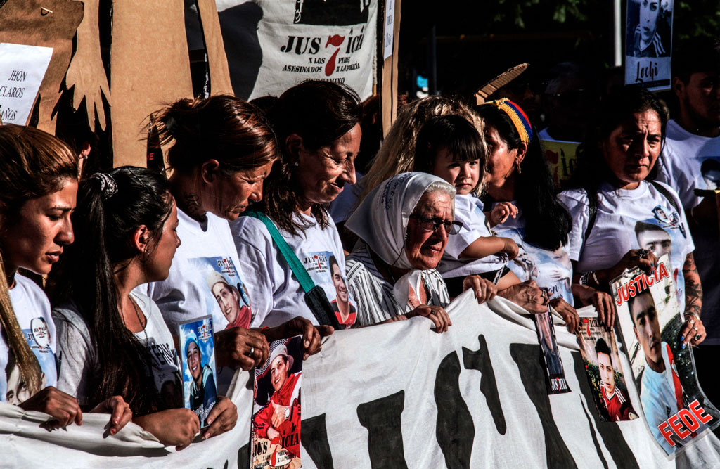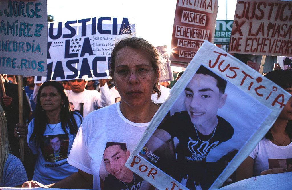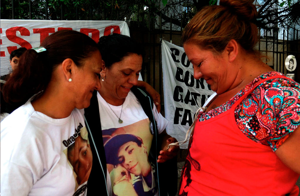 Madres de víctimas represión policial. Las madres en su lucha por justicia para sus hijos, los jóvenes asesinados en las masacres de Pergamino y Echeverría. La espera frente a Tribunales por una sentencia por gatillo fácil. El horror del abandono, la muerte propiciada por y bajo custodia policial y el accionar de las fuerzas represivas en territorio bonaerense es la materialización de una política de Estado selectiva de asedio y tortura hacia los jóvenes en los barrios de menores recursos.