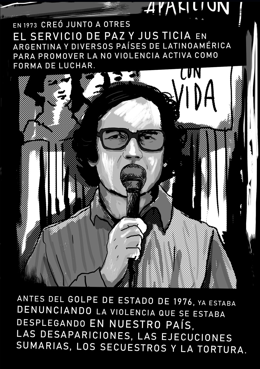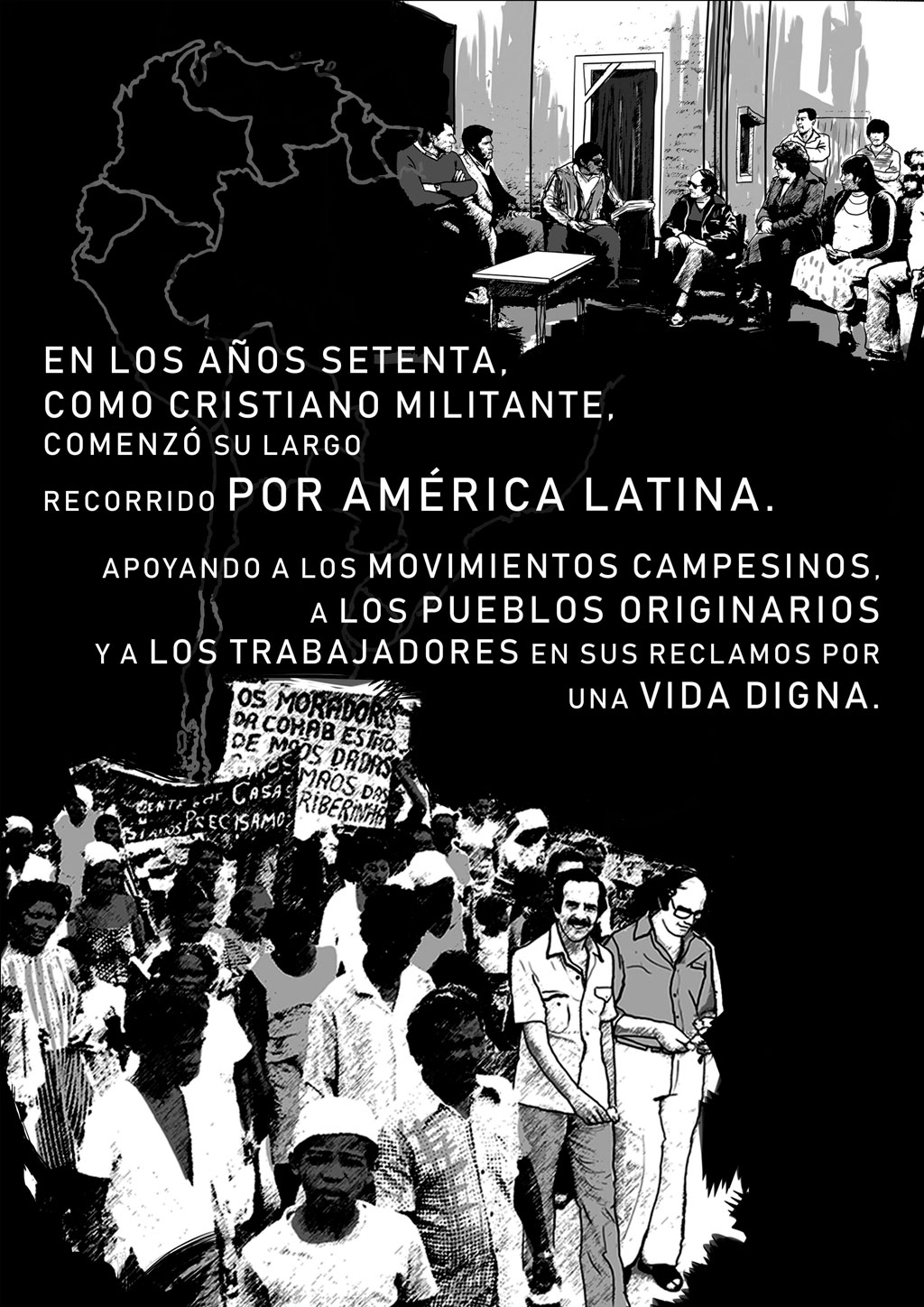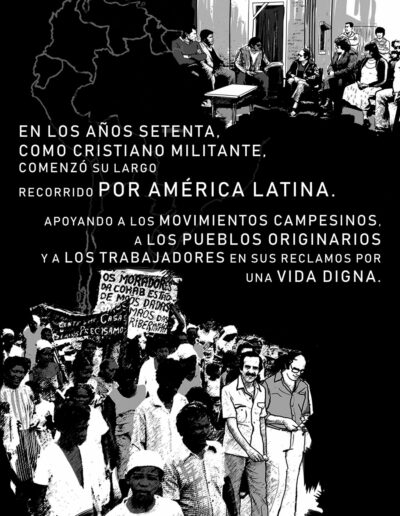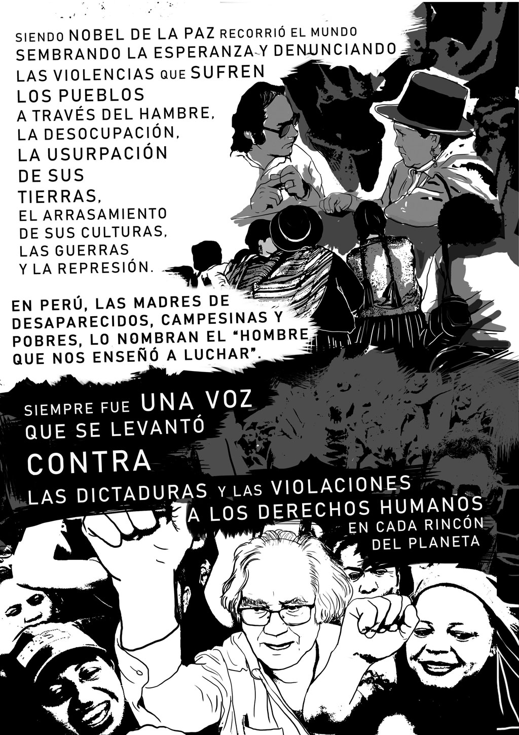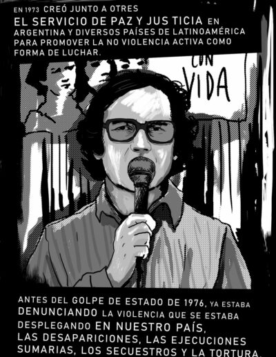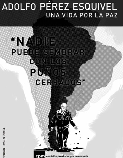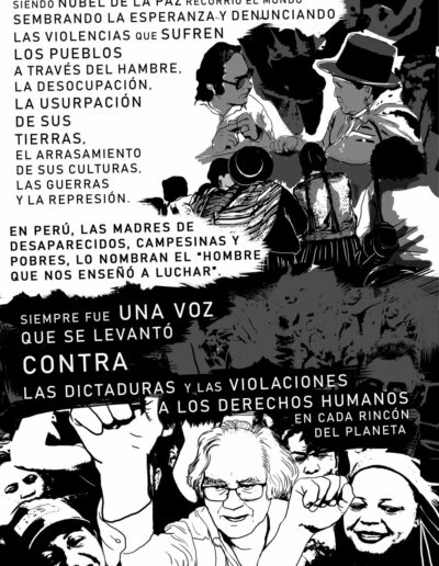 A partir de esta secuencia de viñetas, podrás conocer la biografía en imágenes de una de las figuras más emblemáticas de la lucha por la paz y la justicia en América Latina. Un recorrido plástico por las circunstancias que lo llevaron al Nobel, los dones y fuentes de las que se nutrió para recorrer su camino de militancia de la mano de campesinos, obreros y pueblos nativos del continente.