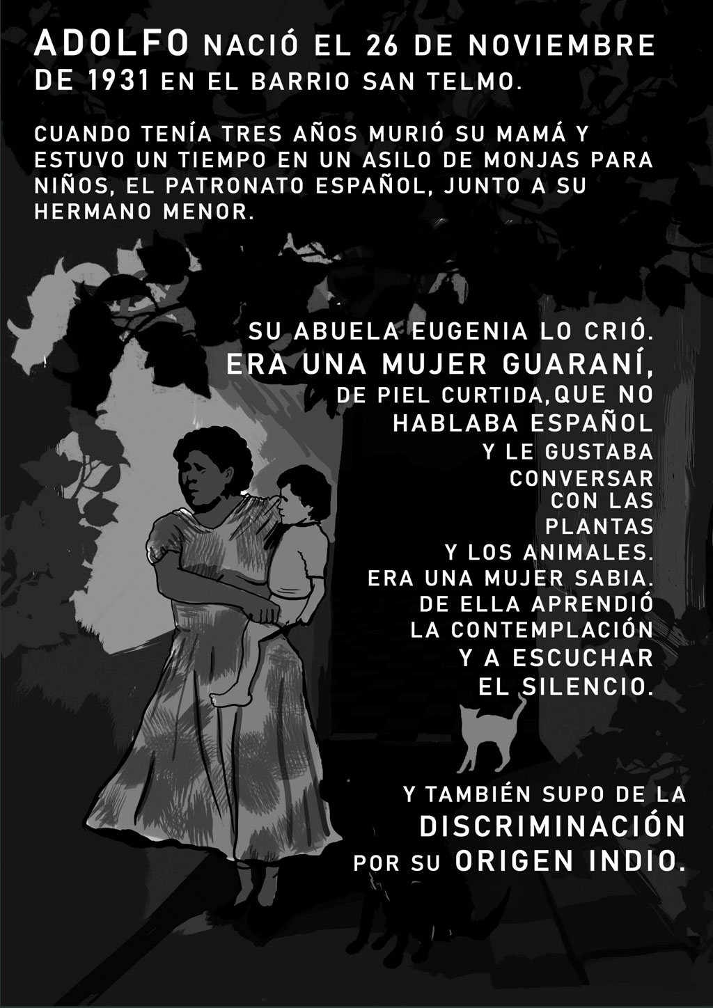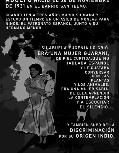 He aquí trazos, imágenes, testimonios de la vida de Adolfo Pérez Esquivel: el nieto de aquella mujer guaraní, el hijo del pescador que se quedó ciego, el niño que vendía diarios en los trolebús de Buenos Aires y le escribía incrédulo a Evita para pedir una pensión para su padre. Adolfo es el padre de Leonardo, Ernesto y Esteban, el compañero de vida de Amanda. Es el abuelo y el bisabuelo. Adolfo es el carpintero que hace los muebles de su casa, el pintor de cuadros y paredes, el maestro y profesor con decenas de honoris causa. Adolfo es el “hombre que enseñó a luchar” a las mamás de Ayacucho, Perú. Adolfo es el sobreviviente de los vuelos de la muerte, el perseguido, secuestrado y torturado, el preso, el exiliado.
