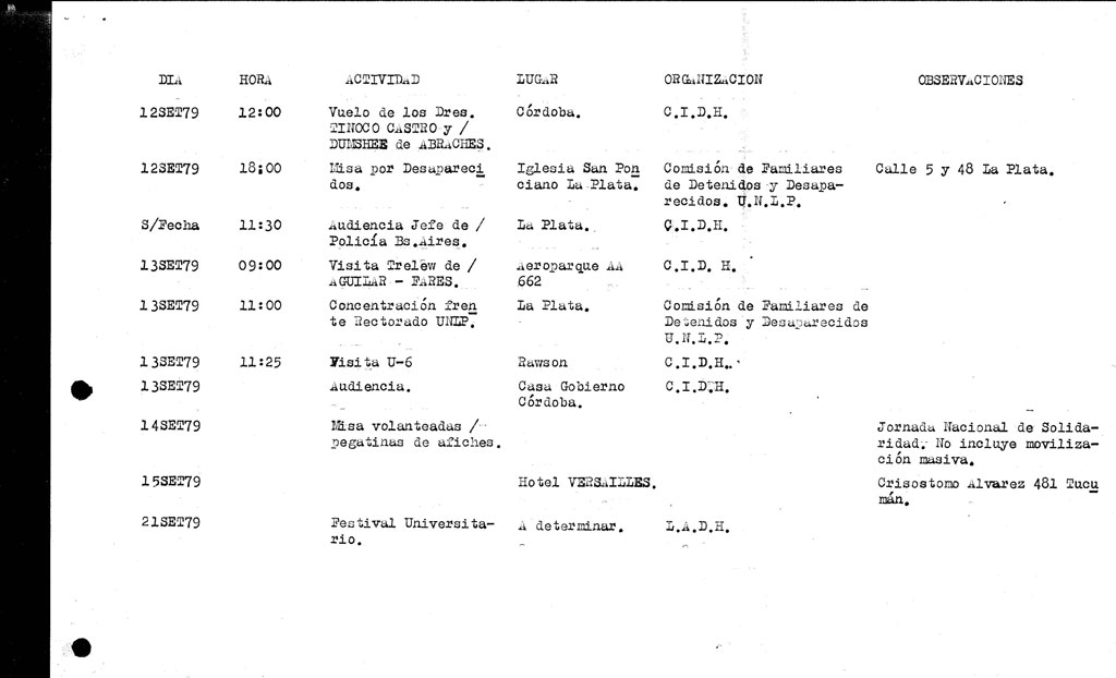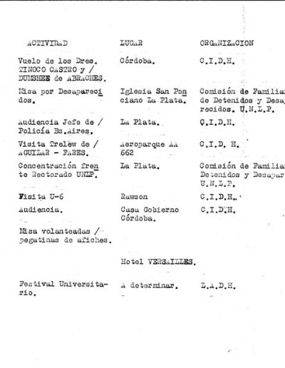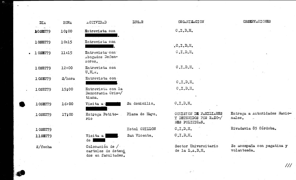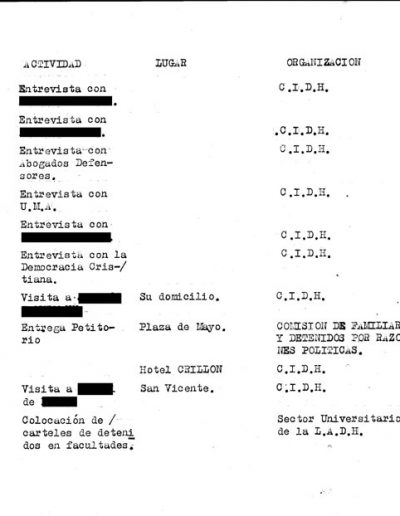 - “Hasta la venida de la CIDH y durante la permanencia de la misma en nuestro país, adquiere particular importancia el control que se efectúe de las organizaciones que coadyuvan con el accionar del oponente subversivo, tales como la APDH, la LADH y la Comisión de Familiares de Desaparecidos y Detenidos”.