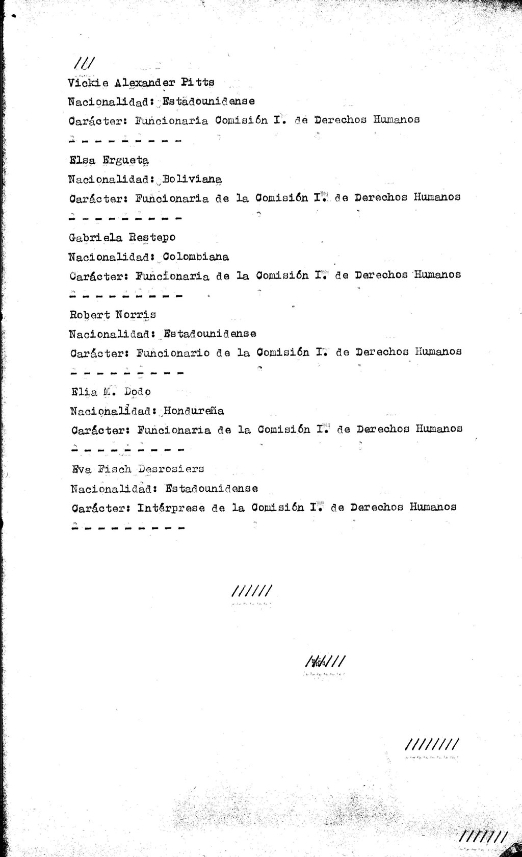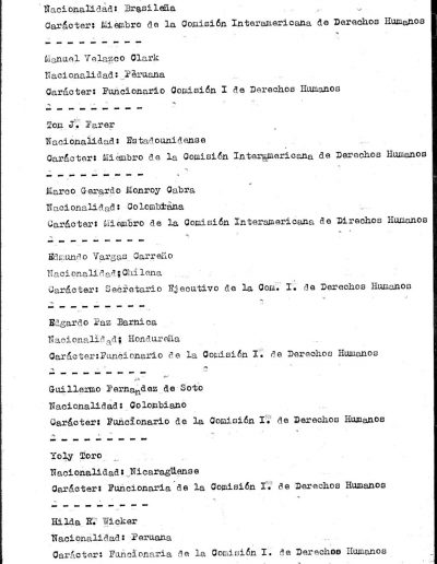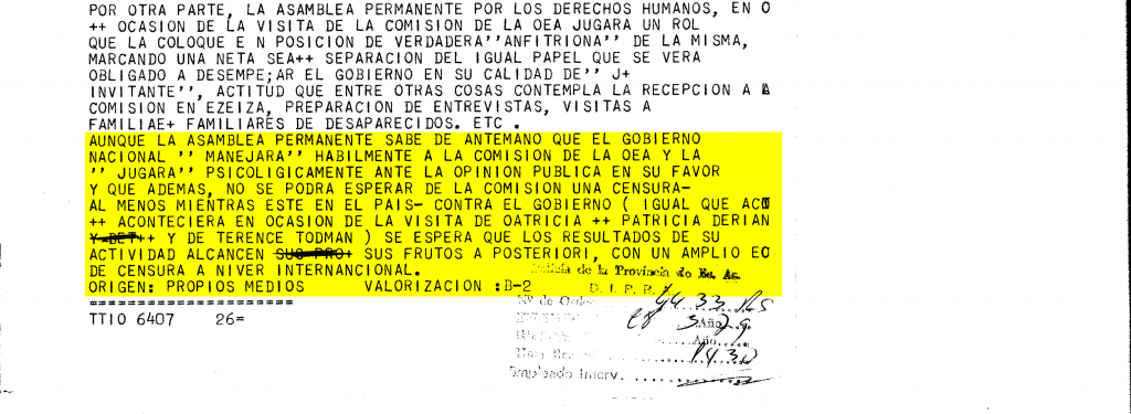En un documento confeccionado 15 días después, el mismo órgano de inteligencia informa las últimas actividades de la APDH en relación a la visita: alerta sobre un viaje a Estados Unidos y el vínculo de este organismo con integrantes de la Comisión de la OEA. A su vez, informa que la APDH viene recopilando información sobre personas detenidas, desaparecidas y secuestradas que fueron objeto de apremios instrumentalizados en actas labradas a través de escribanos públicos, lo que las dota de un valor testimonial de envergadura. El documento expresa que la APDH no solo está reuniendo información vinculada a los nombres de las víctimas sino también de las circunstancias que rodearon cada episodio, con especial énfasis en detalles que puedan tener alguna significación: marcas, modelos, color, patentes de vehículos intervinientes en procedimientos, uniformes de personal interviniente, nombres que puedan haberse oído y/ó proporcionado de dicho personal, identificación de lugares de detención, nombres de personal que haya atendido a posteriori los reclamos de los familiares de las víctimas, expresiones por ellos vertidas, etc.