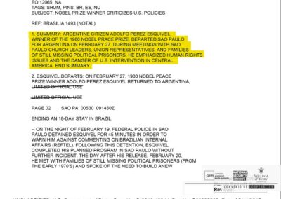 En la reseña sobre la visita de Adolfo a Brasil hay otros dos hechos de enorme relevancia: uno histórico, el otro personal. Al comienzo de su viaje, la noche del 19 de febrero, fue detenido durante 45 minutos por la policía federal en San Pablo. Sin dar mayores detalles, el informe de la embajada dice que la detención fue para advertir al Nobel de la Paz contra los comentarios respectos de asuntos internos del Brasil. Como recordaría Adolfo Pérez Esquivel en más de una oportunidad, esa no fue la primera vez que fue detenido en Brasil, ya le había ocurrido en 1975; en las dos oportunidades fue liberado tras la intervención del arzobispo Paulo Evaristo Arns