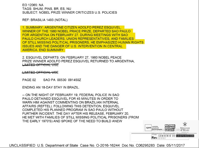 Ese compromiso con los pueblos latinoamericanos oprimidos, que le valió el galardón del parlamento noruego, lo ubicó muchas veces en contextos y situaciones que fueron observadas y registradas por las diferentes embajadas norteamericanas en América Latina y reportadas al departamento de estado en Washington. De una u otra manera, las causas que Adolfo acompañó generaron especial atención.