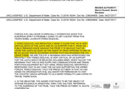 De todas ellas, hay una que fue especialmente observada por la diplomacia estadounidense: el caso de El Salvador. Pérez Esquivel fue muy crítico de la intervención de EEUU en la vida política de ese país. A los pocos días del anuncio del Premio Nobel en octubre de 1980, la embajada de Buenos Aires elaboró un informe cuya principal preocupación se centraba en la cuestión.