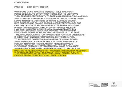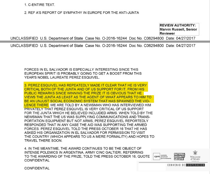 El documento advierte que la premiación de Pérez Esquivel puede constituir un impulso para el sentimiento europeo anti junta militar de gobierno en El Salvador. Seguido a esto, describe detalladamente el posicionamiento del premiado que, según el informe, se ha manifestado repetidamente de manera crítica respecto de la Junta de Gobierno como del apoyo recibido por el gobierno de los Estados Unidos.