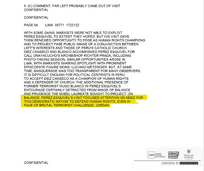 Más allá de las apreciaciones de la Embajada, los hechos descritos en el propio informe señalan, una vez más, la opción de Adolfo por las causas de los pueblos latinoamericanos. Esta estadía de Adolfo en Perú coincidió con la masacre de 21 aldeanos en el departamento de Ayacucho. Adolfo visitó el lugar y acompañó a familiares de las víctimas. No sería la última vez: en 1985 junto a Mamá Angélica, ícono de la lucha en Ayacucho, Adolfo marchó para reclamar justicia. Todavía hoy lo recuerdan como el hombre que les enseñó a luchar.