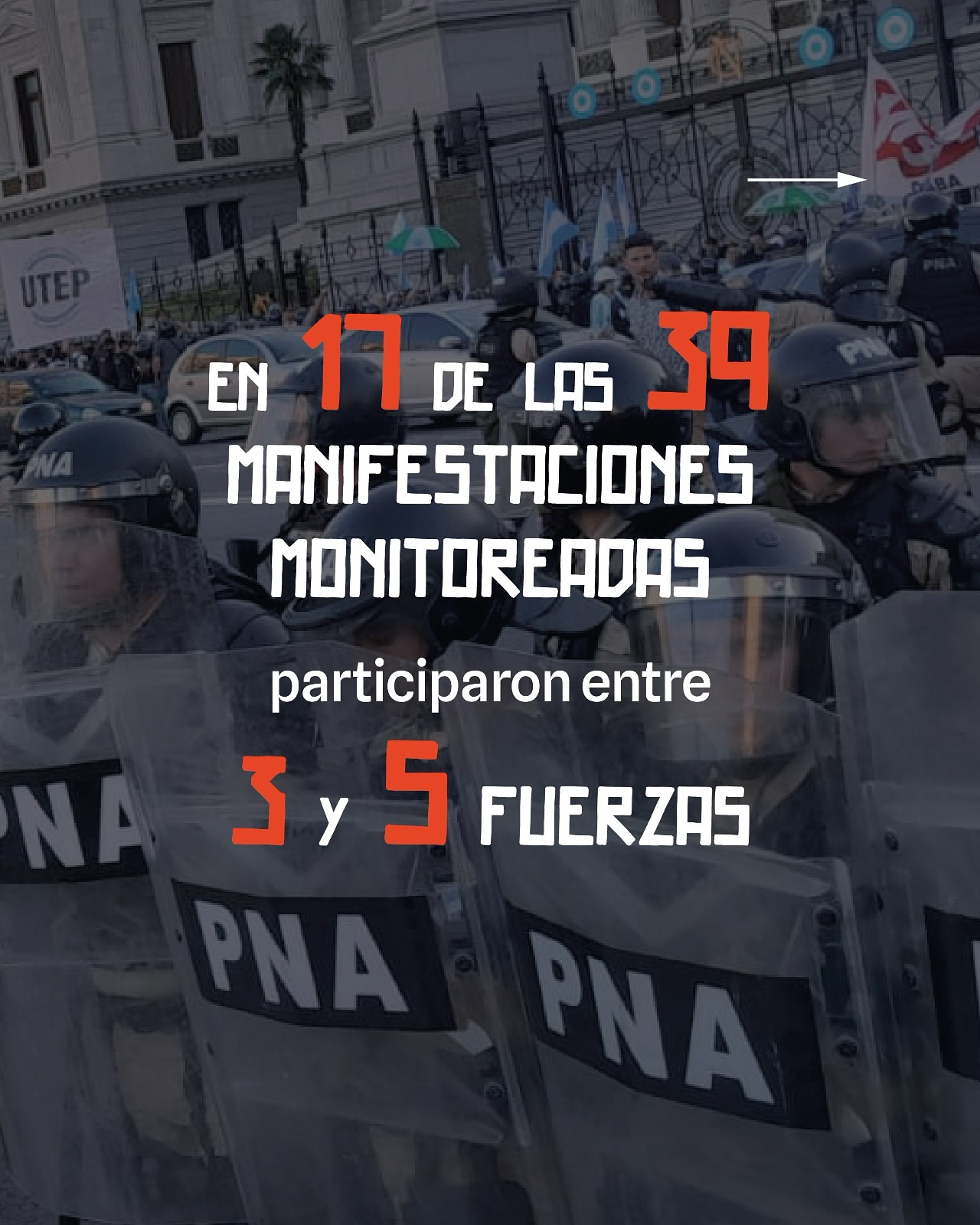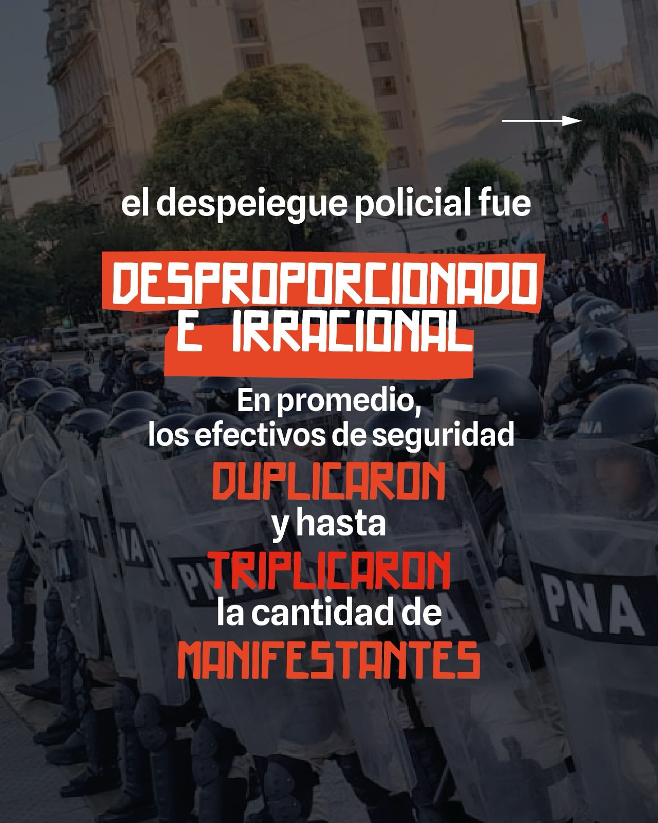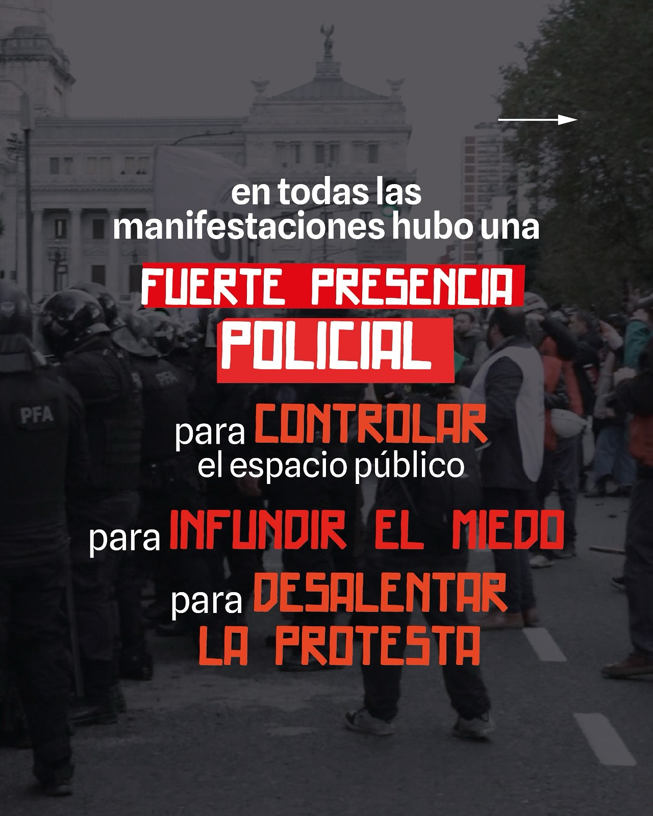 En todas las manifestaciones se registró un despliegue policial desproporcionado en número y recursos en relación a la cantidad de manifestantes convocados, tanto en el lugar de la concentración como en las zonas aledañas. En distintas marchas llegaron a duplicar y hasta triplicar la cantidad de participantes. El objetivo principal de las fuerzas de seguridad se centró en el control del espacio público y la aplicación extralimitada y arbitraria del denominado protocolo antipiquetes, llegando a reprimir sobre las veredas y las plazas.