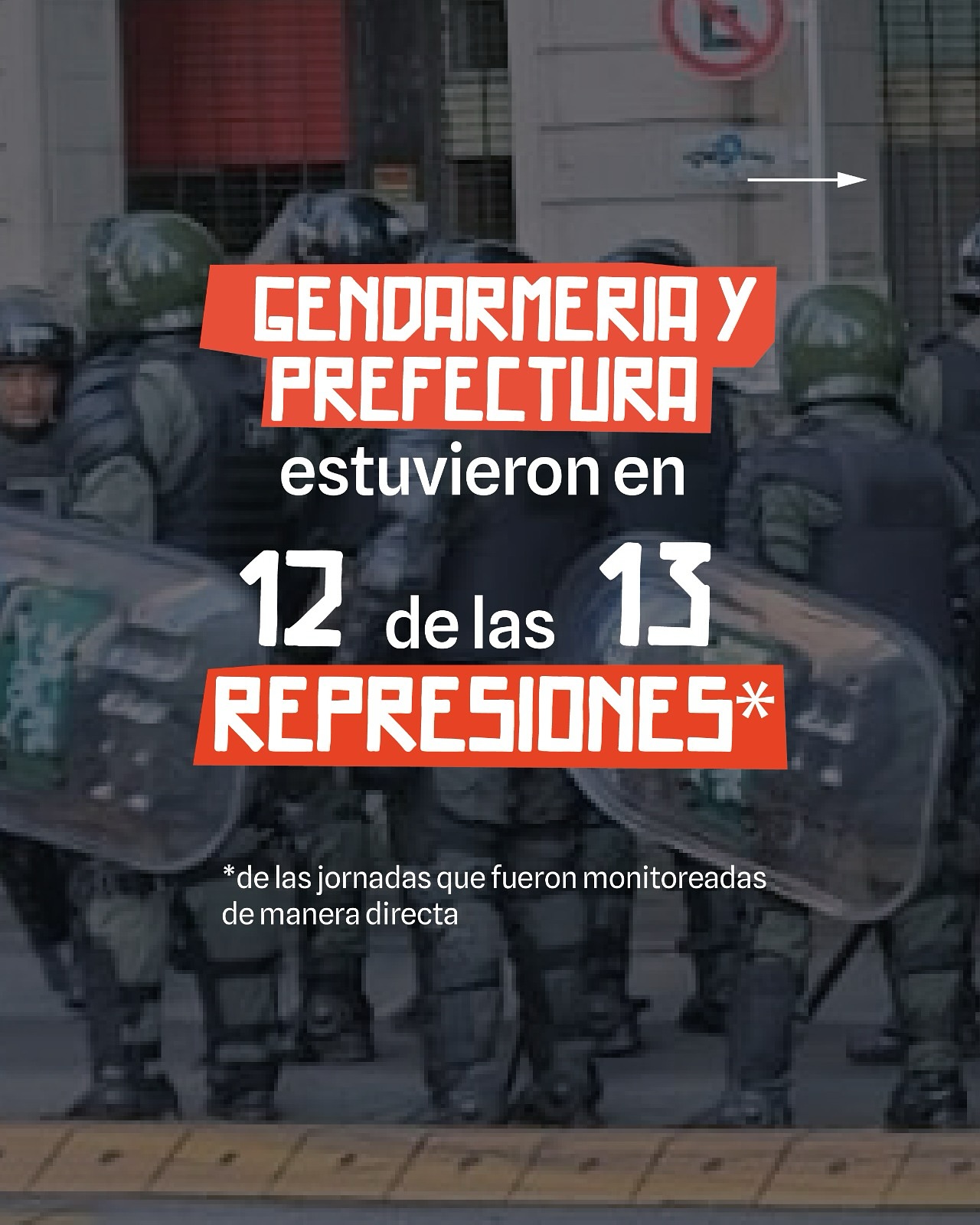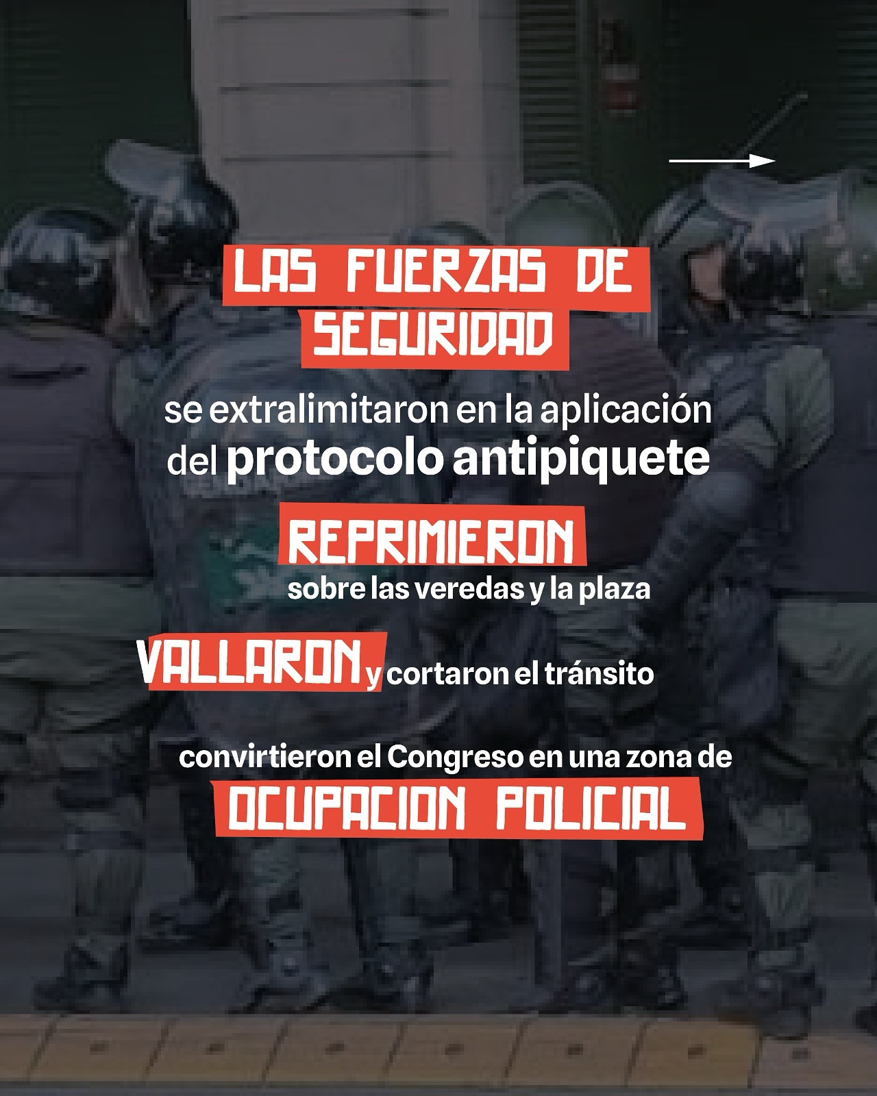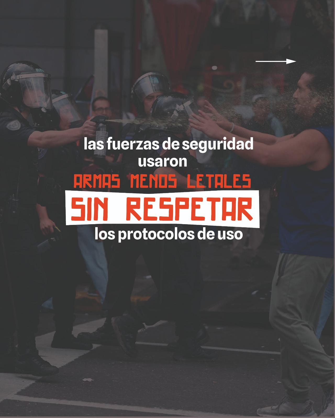 Las fuerzas federales –Policía Federal, Gendarmería Nacional, Prefectura y Policía de Seguridad Aeroportuaria– y la Policía de la Ciudad de Buenos Aires utilizaron contra las y los manifestantes armas menos letales de manera irracional y desproporcionada, sin respetar los protocolos de usos. Dispararon con postas de goma a corta distancia y contra zonas vitales, arrojaron gases químicos sobre los rostros, lanzaron agua a presión, y golpearon con tonfas y escudos.