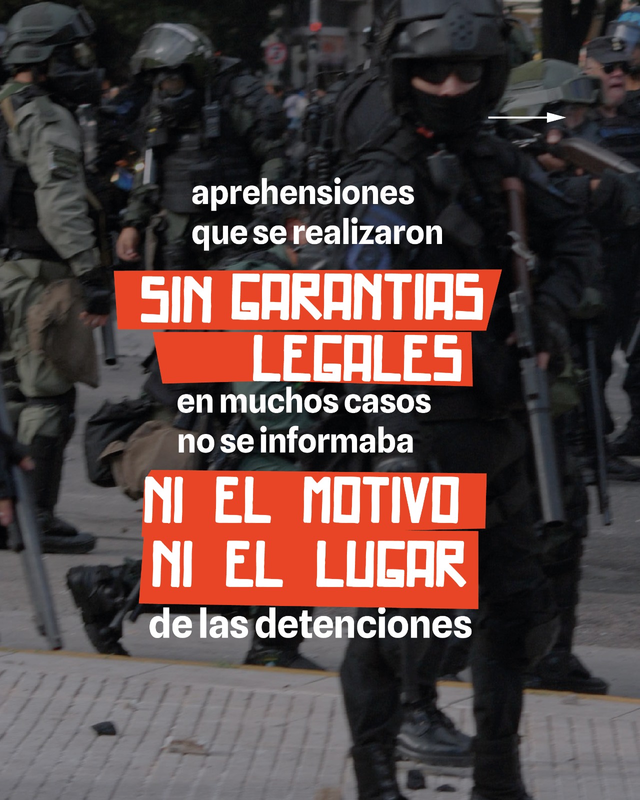 El despliegue de esta aceitada maquinaria represiva ilegal, sostenida por el Gobierno nacional, tiene por objetivo generar el temor en quienes se manifiestan y limitar la participación. La institucionalización de la violencia, su legitimación, defensa y celebración generan una fuerte degradación del sistema democrático y sus instituciones.