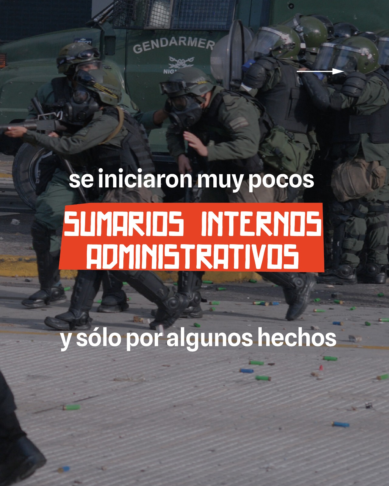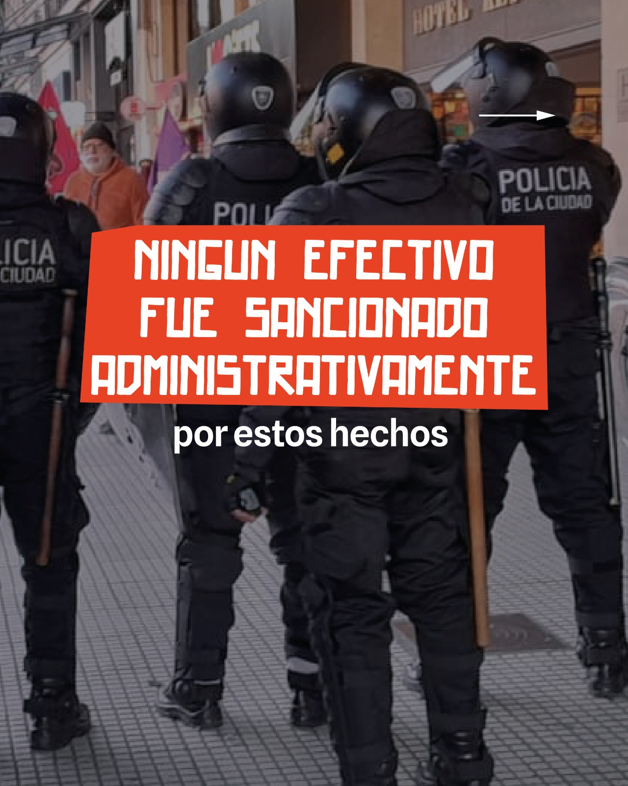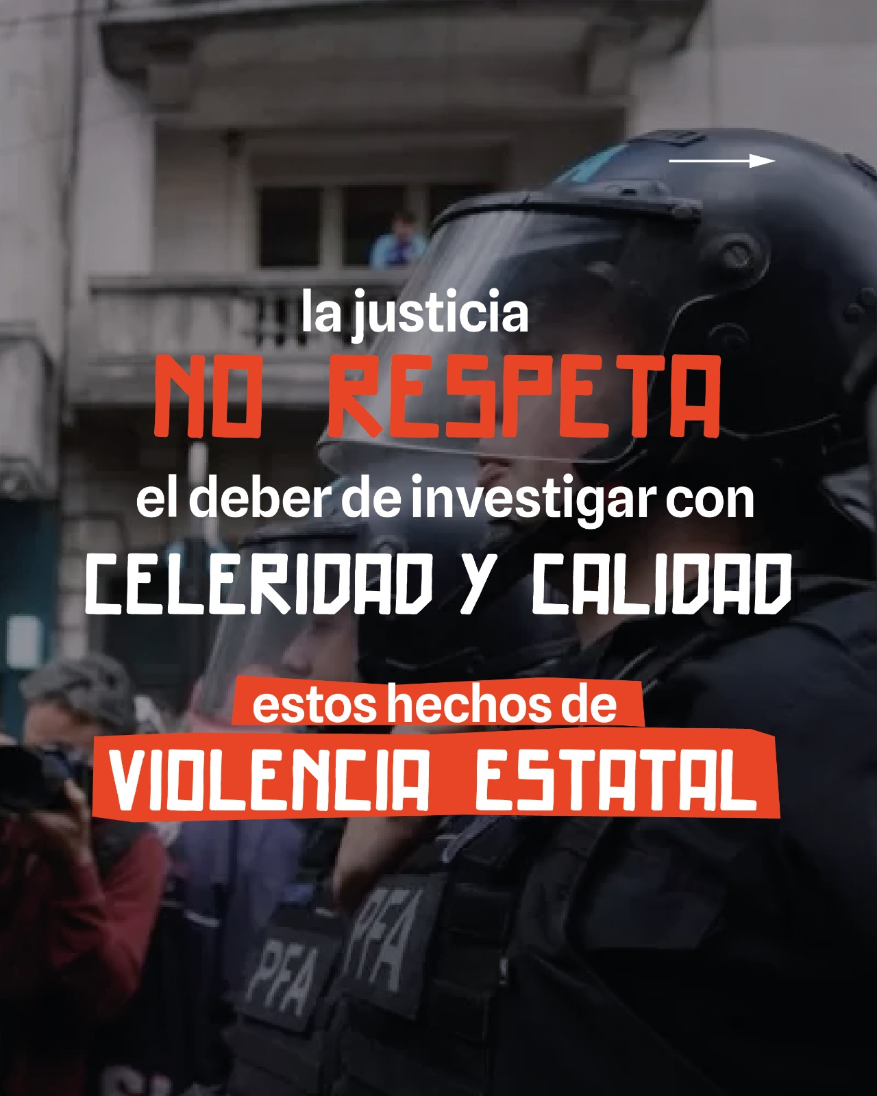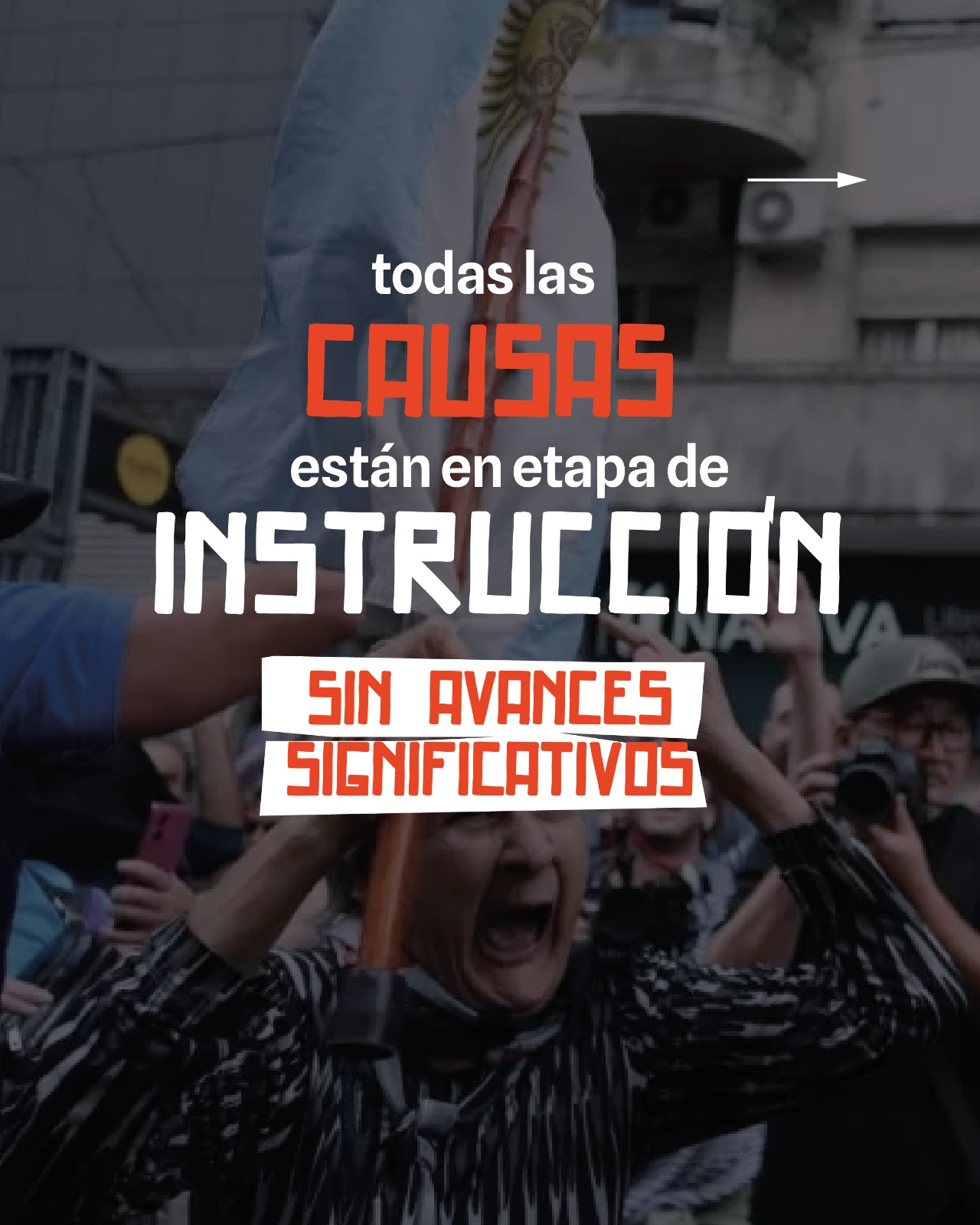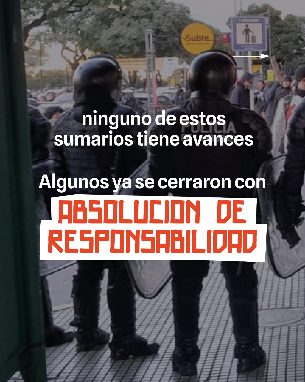 Por otra parte, a pesar de la gravedad de estos hechos, de la documentación de la represión y sus consecuencias, los funcionarios responsables de estos actos de violencia estatal gozan de impunidad: las causas penales iniciadas están todas en etapa sin instrucción sin mostrar avances significativos y los sumarios internos administrativos menos, muchos de ellos incluso ya se cerraron absolviendo de responsabilidades a los agentes de las fuerzas de seguridad.