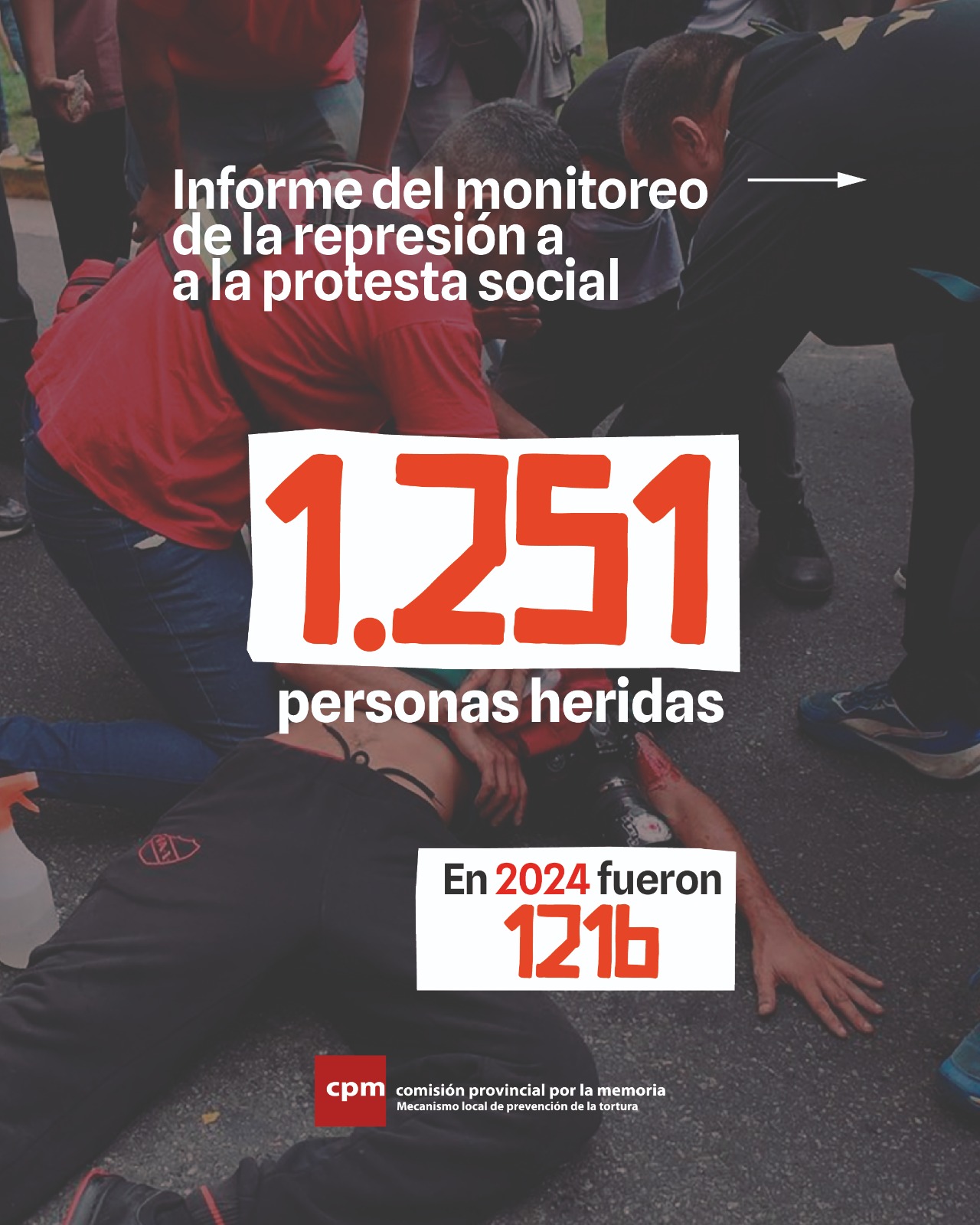 Al menos 1.251 personas fueron heridas, 36 más que en todo el año 2024. Las víctimas tuvieron lesiones de distinta gravedad, dos de ellas muy graves: uno perdió la visión de su ojo, el otro, el fotoreportero Pablo Grillo, estuvo internado en terapia intensiva durante 83 días, con una fractura de cráneo producto del impacto con una bomba de gas lacrimógeno; aún hoy, Grillo continúa internado recuperándose de las graves lesiones.