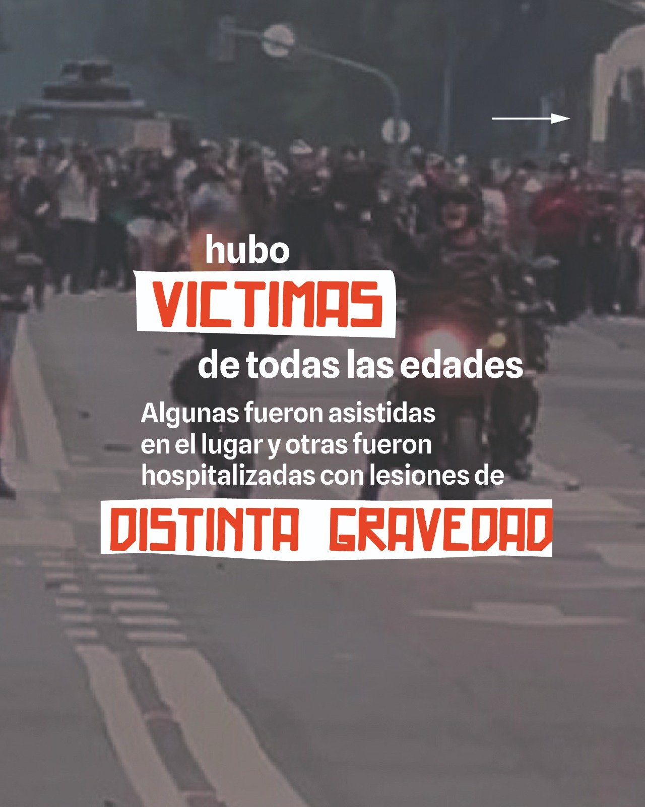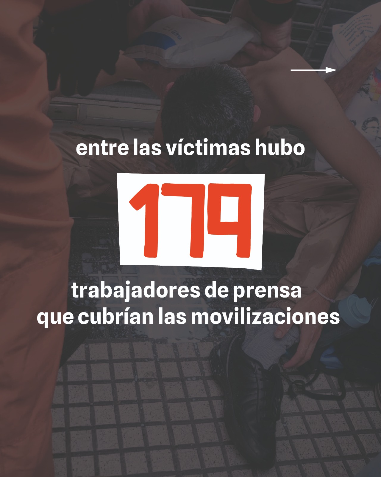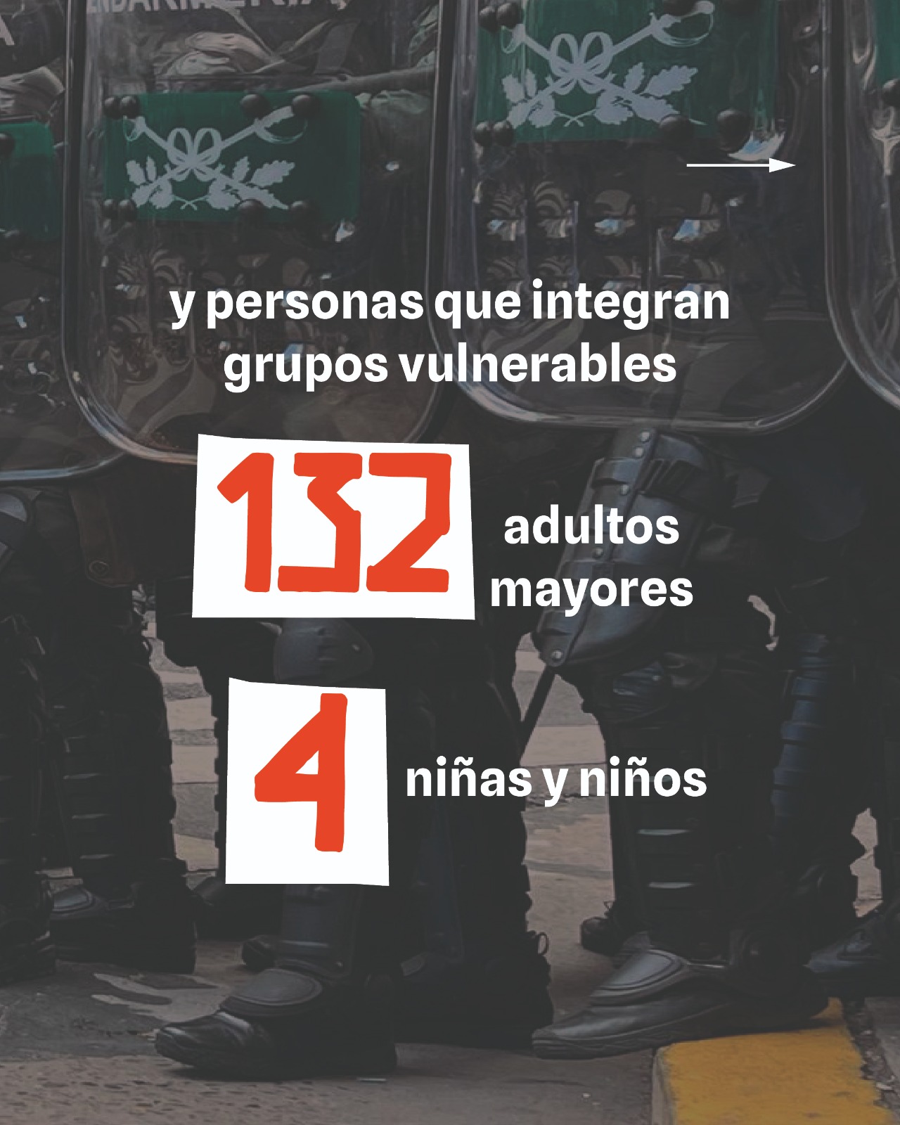 Entre las víctimas, hubo 132 adultos mayores y 4 niños, niñas y adolescentes, 179 periodistas que cubrían los hechos y al menos 20 defensores de derechos humanos, entre ellos integrantes del equipo de monitoreo de la CPM, que desempeñaban tareas de control del despliegue policial.