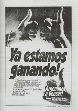 “YA ESTAMOS GANANDO. Porque luchamos por una idea grande. Porque nuestros soldados la están defendiendo. Porque ahora todos sabemos apretar los dientes. Porque los argentinos nos volvemos a mirar como hermanos. Porque estamos haciendo de cada lugar de trabajo un puesto de combate. Porque por fin, y para siempre, somos una sola fuerza. ARGENTINOS A VENCER! Cada uno en lo suyo, defendiendo lo nuestro”.