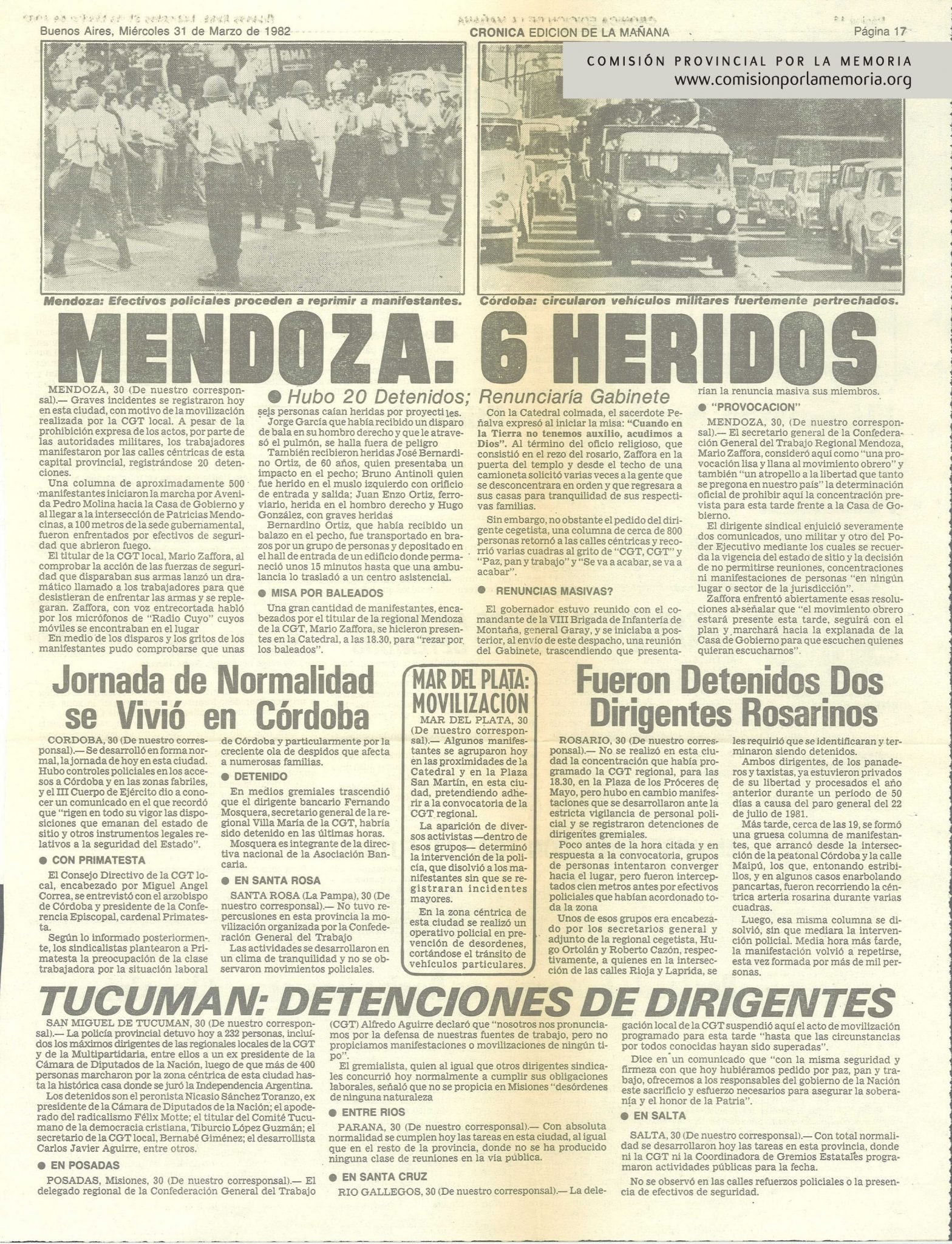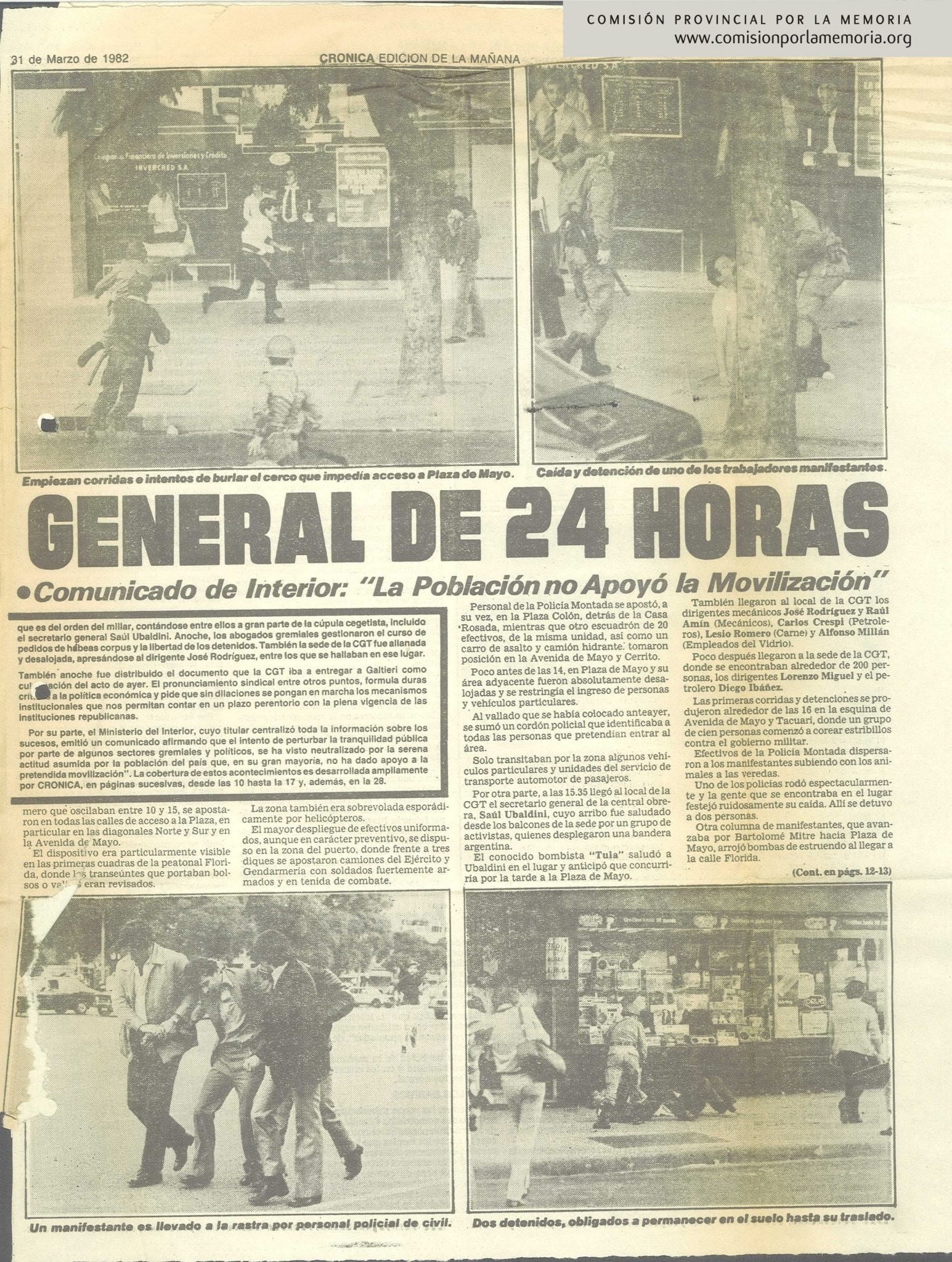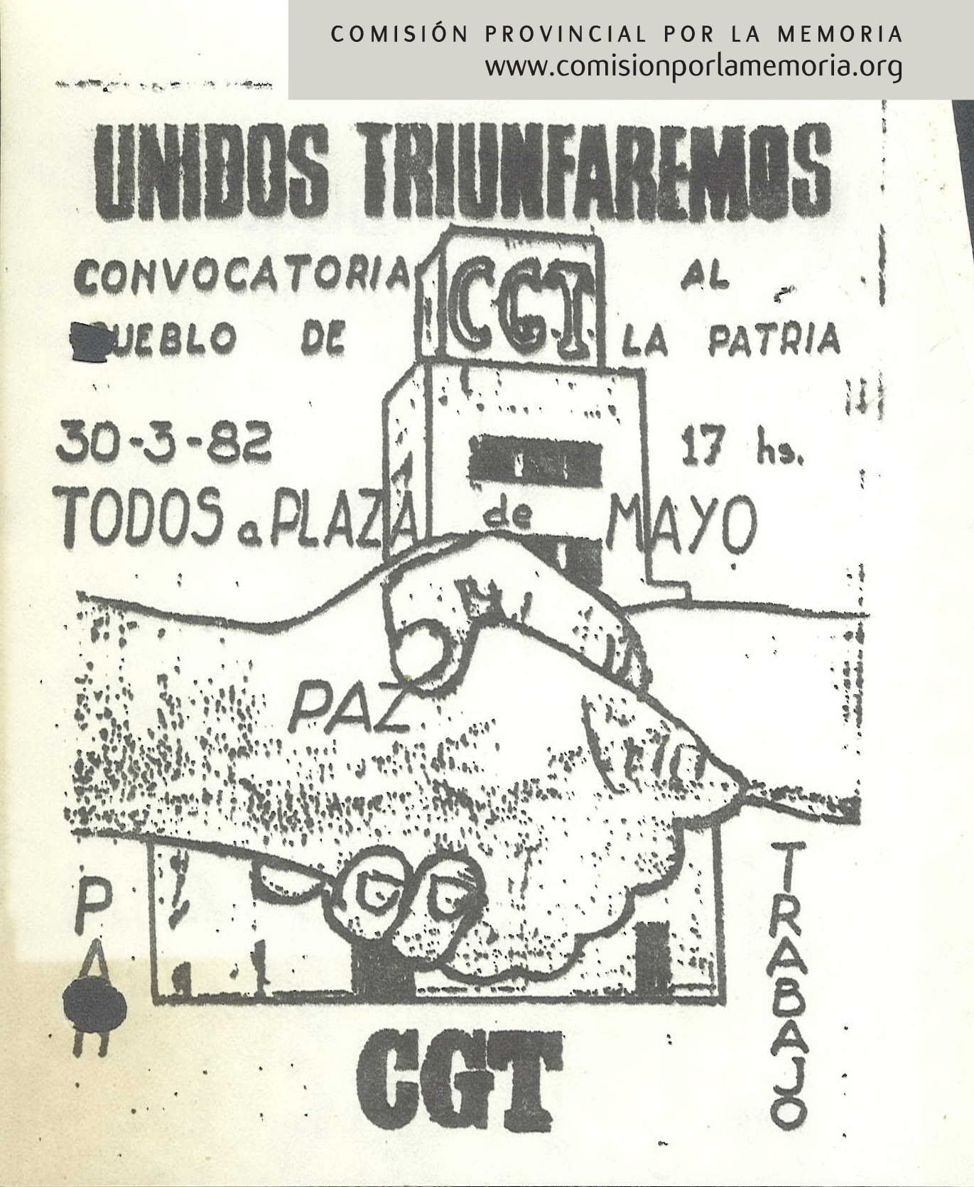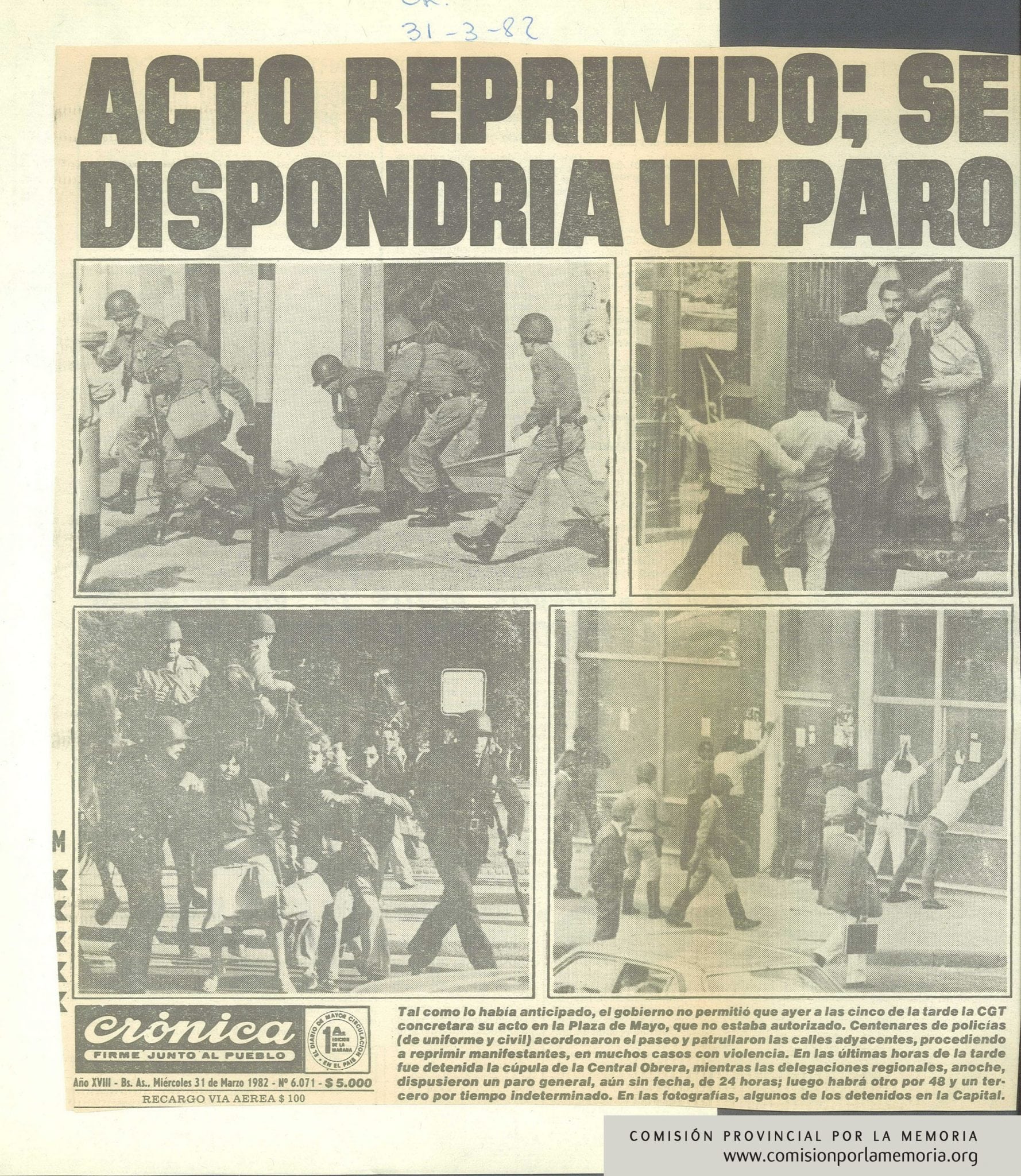 Desde 1981 la sociedad había comenzado a recuperar ciertos espacios de expresión política y cultural. La CGT convoca a paro y movilización para el 30 de marzo, en protesta por la política económica y social llevada adelante por la dictadura. Se realiza una multitudinaria concentración en Plaza de Mayo y en otras ciudades del país. La represión tiene una fuerte presencia, una vez más: hay varios heridos, detenidos y un muerto en la provincia de Mendoza.