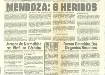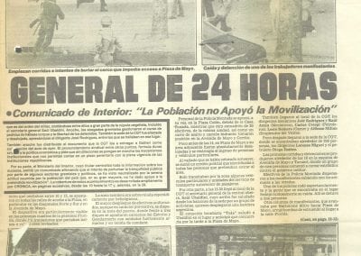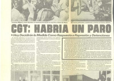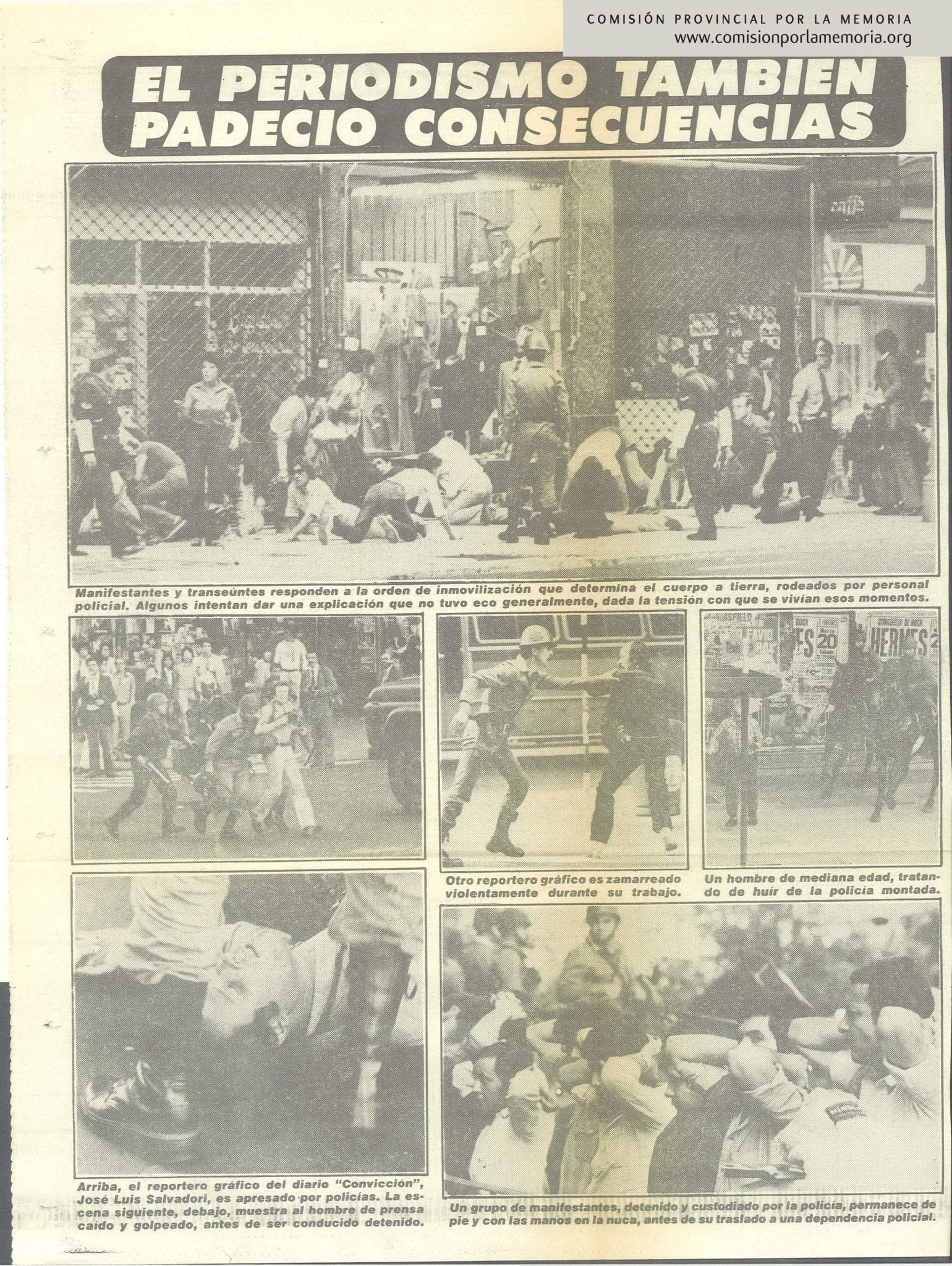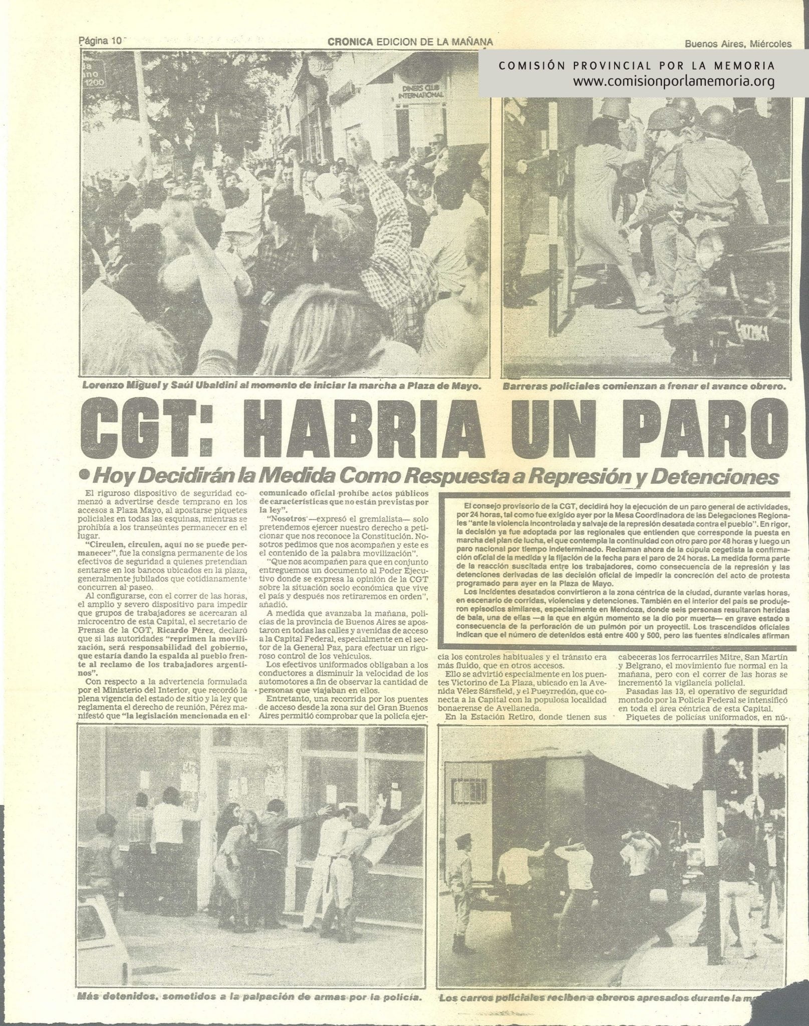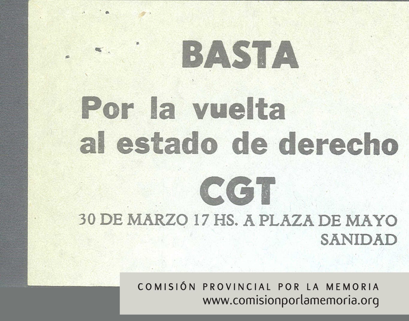 Desde 1981 la sociedad había comenzado a recuperar ciertos espacios de expresión política y cultural. La CGT convoca a paro y movilización para el 30 de marzo, en protesta por la política económica y social llevada adelante por la dictadura. Se realiza una multitudinaria concentración en Plaza de Mayo y en otras ciudades del país. La represión tiene una fuerte presencia, una vez más: hay varios heridos, detenidos y un muerto en la provincia de Mendoza.