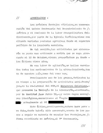 Si bien los curas tercermundistas fueron un actor largamente vigilado, en los legajos reunidos por motivo del V Centenario de la conquista se observa un especial interés en hacer inteligencia sobre estos grupos religiosos que cuestionen el rol de la Iglesia Católica en la Conquista de América. La información está reunida en la Mesa De que incluía los factores social y religioso. Uno de los legajos contiene una breve descripción de Encuentro Cristiano con cinco puntos de análisis: origen, evolución, sede de la organización, autoridades y aparato político propagandístico.