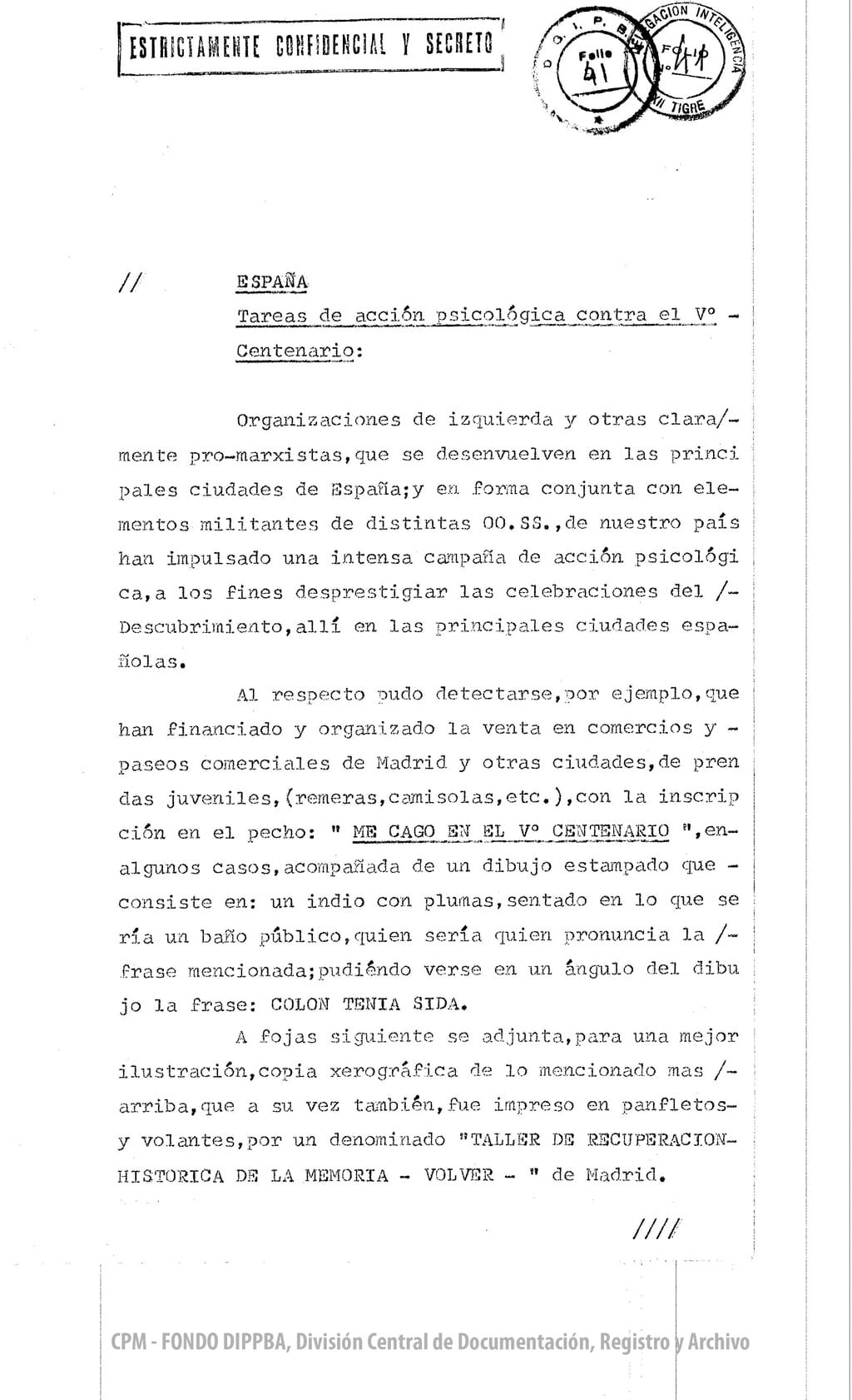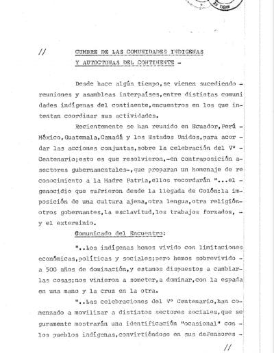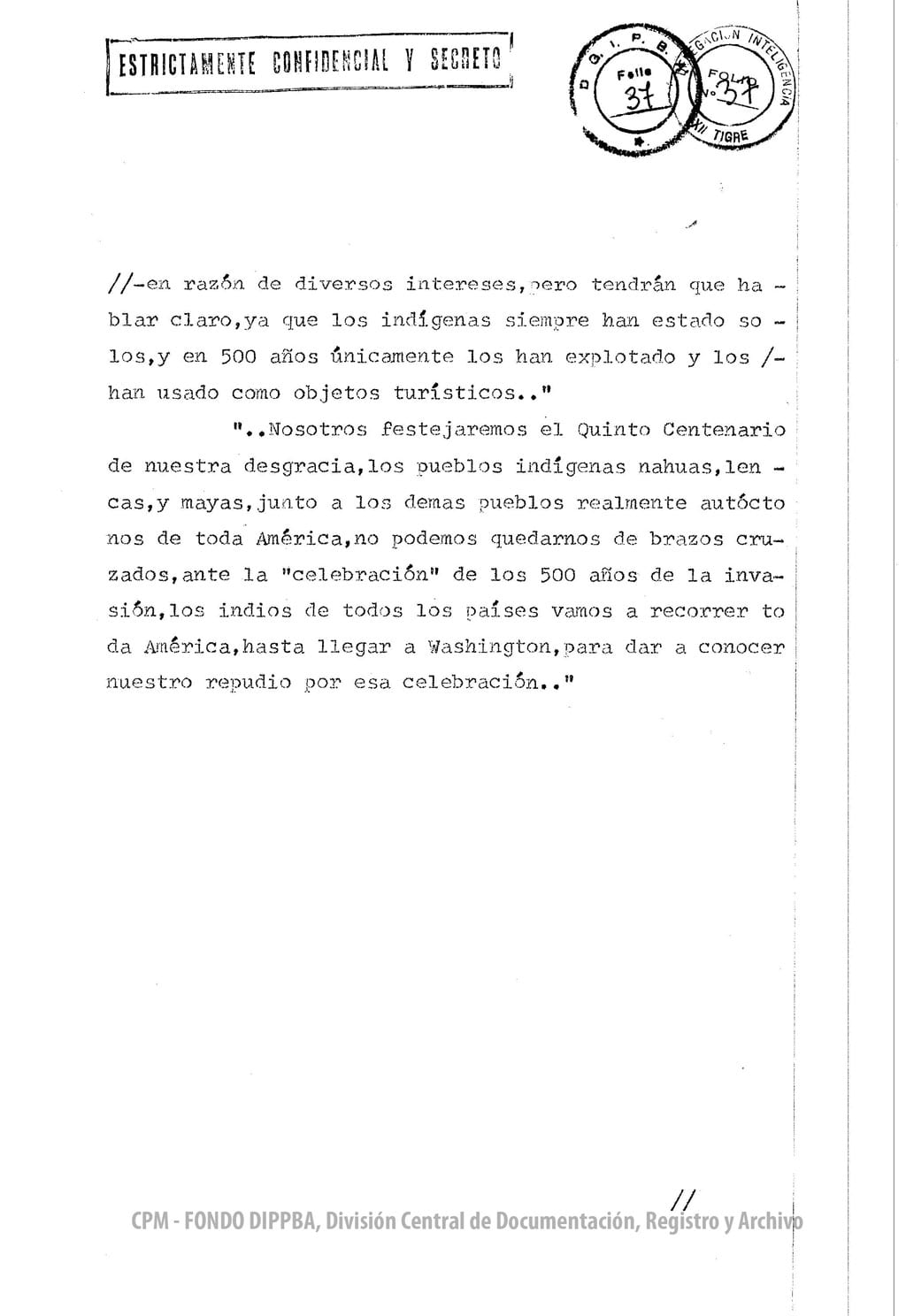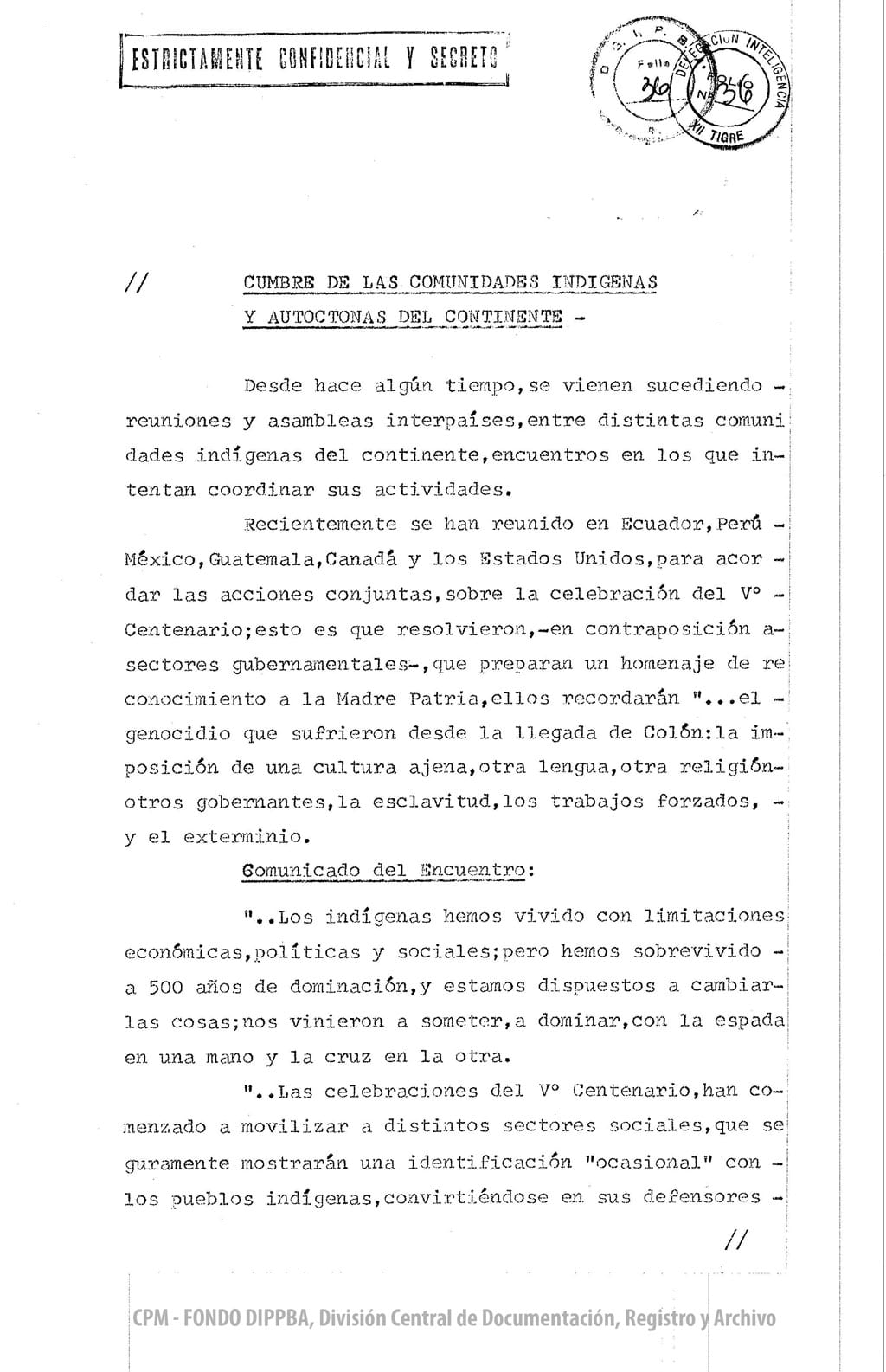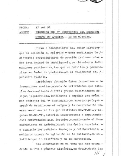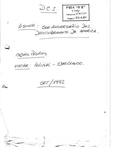 Estas fojas forman parte del legajo 33.681 de la mesa “D.S.” (delincuentes subversivos), iniciado en septiembre de 1992, bajo el factor “policial—ideológico” y con el título: “500 aniversario del descubrimiento de América”. El espionaje sobre las actividades de contra festejos por los 500 años de la conquista de América también recayó sobre el factor social y religioso.