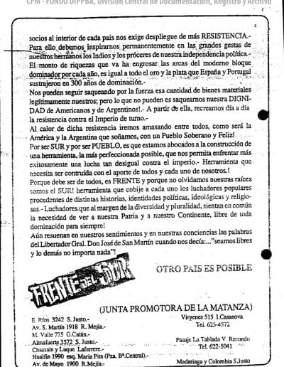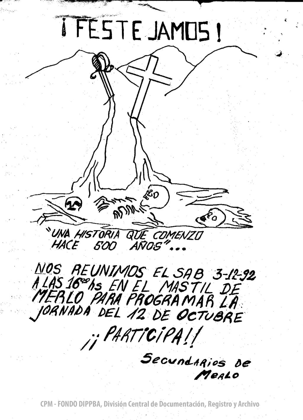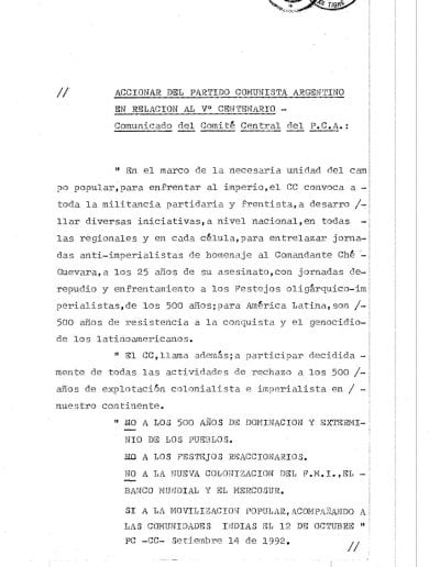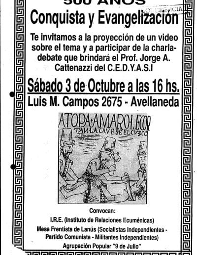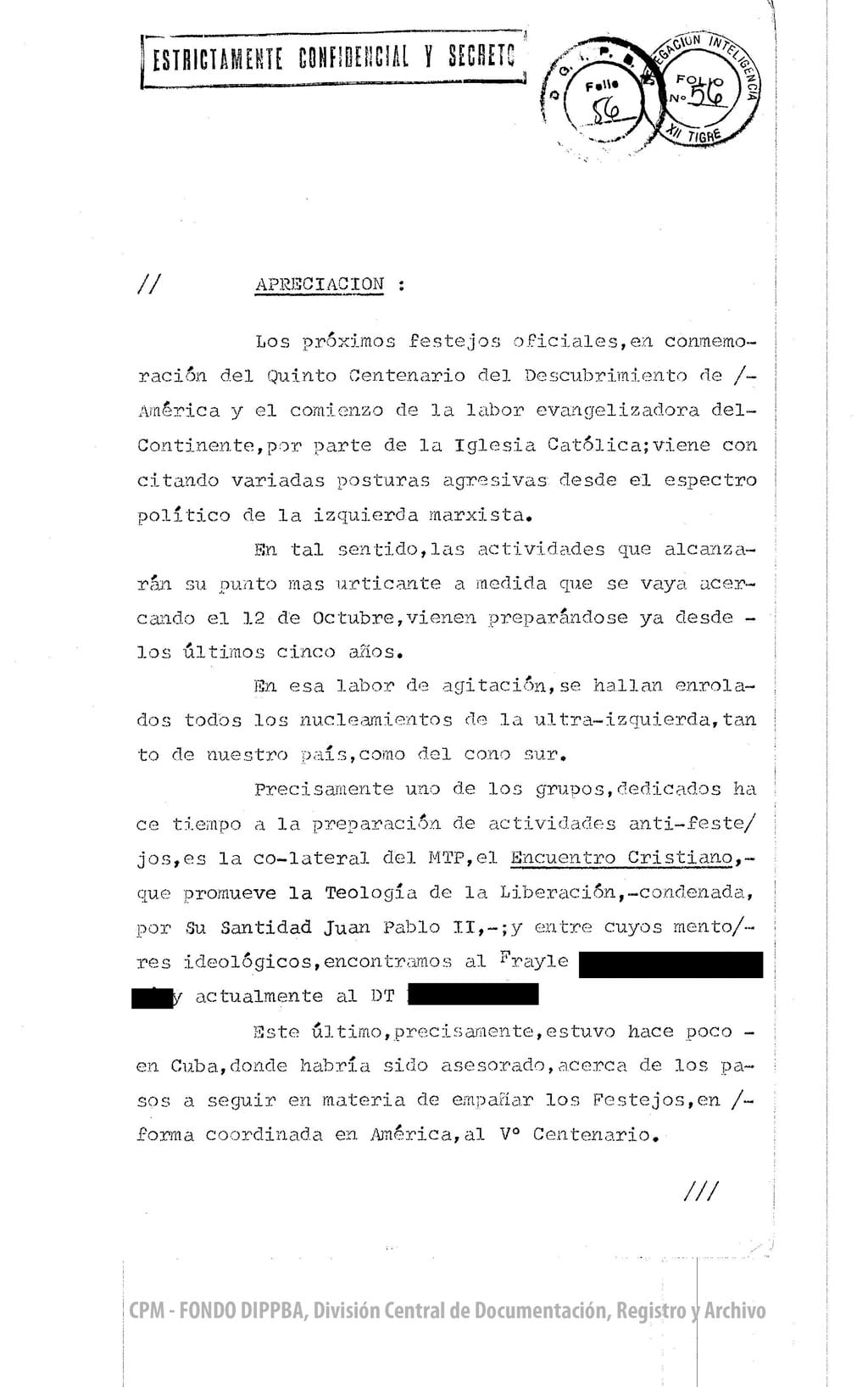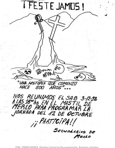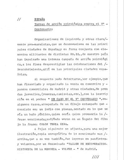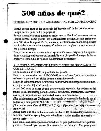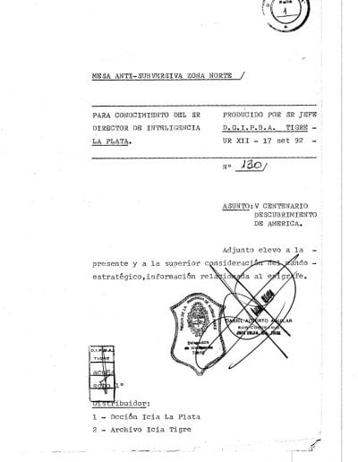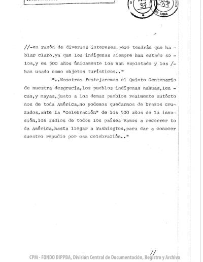 Estas fojas forman parte del legajo 33.681 de la mesa “D.S.” (delincuentes subversivos), iniciado en septiembre de 1992, bajo el factor “policial—ideológico” y con el título: “500 aniversario del descubrimiento de América”. El espionaje sobre las actividades de contra festejos por los 500 años de la conquista de América también recayó sobre el factor social y religioso.