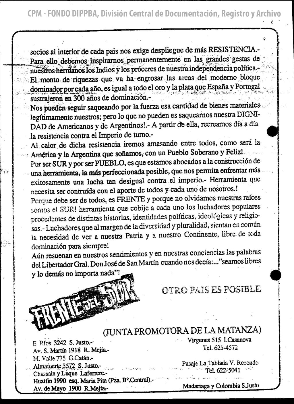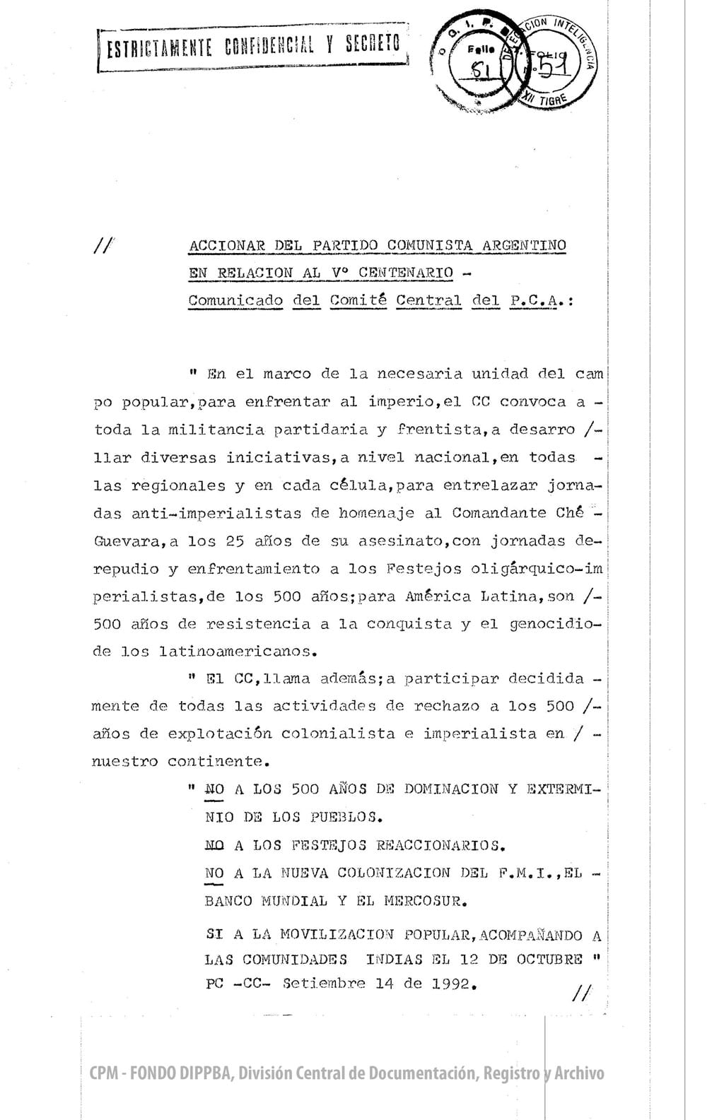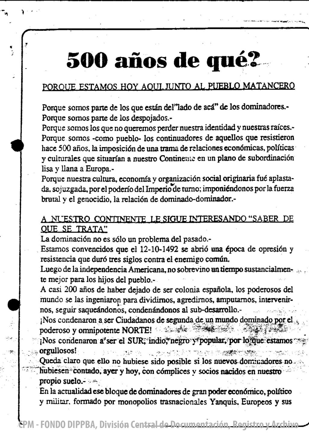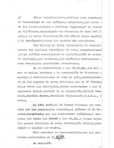 “Utilizan como argumento el ‘exterminio’ de los indígenas americanos por parte de los conquistadores e intentan ‘aggiornar’ su discurso dialéctico, trasladando esa conquista de hace 500 años a la nueva ‘colonización del FMI, el Banco Mundial y el Pentágono’ contra los pueblos del continente”, dice un documento de la Dirección de Inteligencia de la Policía de la Provincia de Buenos Aires (DIPPBA) que se inició ante una hipótesis de conflicto: “Eventual accionar de las BB.DD.TT. [bandas de delincuentes terroristas] contra los festejos del Vº centenario”.