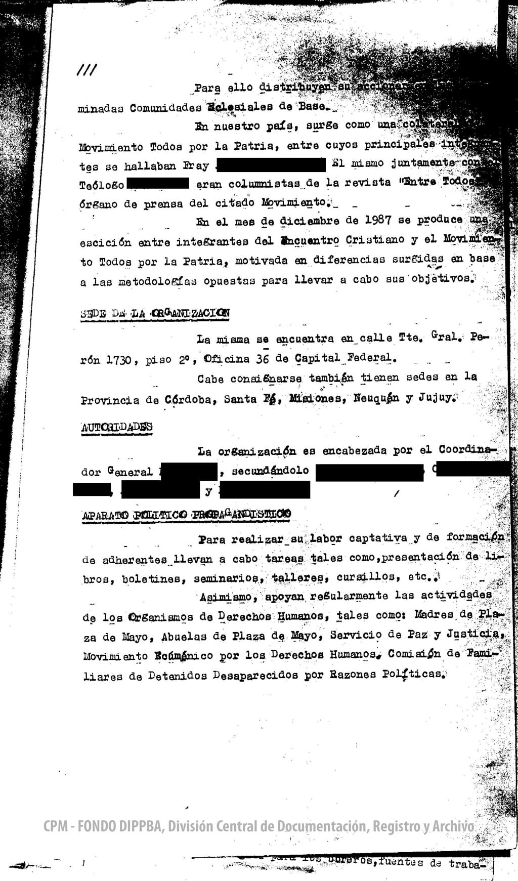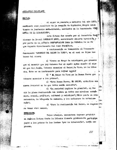 Encuentro cristiano fue una de esas comunidades eclesiales de base que acompañaron las acciones de resistencia indígena frente a los festejos oficiales de 1992. El legajo sostiene que Encuentro cristiano se enrola en la Teología de la Liberación que aparece brevemente conceptualizada: “fue creada por el Sacerdote Franciscano de Brasil Leonardo Boff, encontrando abierta oposición por parte de la Sagrada congregación para la defensa de la fe”, también transcribe parte del documento Anuncio del Reino de Dios, que fija las bases de la teología de la liberación. Y después la DIPPBA hace la siguiente apreciación: “Tales ideales encuentran terreno propicio en América Latina donde la Iglesia llamada progresista participa junto a los pobres de las luchas ‘por la liberación’”.