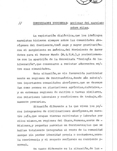 Esa solidaridad con los pueblos originarios también estuvo en el ojo de la DIPPBA que se encargó en sus informes de desprestigiar: para la inteligencia de la Policía Bonaerense todo se reducía a un acto de manipulación de ideólogos marxistas y curas tercermundistas. “La explotación dialéctica, que los ideólogos marxistas hicieron siempre sobre las comunidades aborígenes del Continente, tomó auge y mayor gravitación con el surgimiento en América del Movimiento de Sacerdotes para el Tercer Mundo, y posteriormente con la aparición de la denominada “Teología de la Liberación”, que comenzaron a reclutar adherentes entre esas comunidades”, señala la DIPPBA. Y agrega: “Es así que, bajo la influencia del MSTM se van creando en el continente agrupaciones filo-marxistas que nuclean a las comunidades indígenas, lanzándolas a una puja dialéctica que sirve a los objetivos de los primeros”.