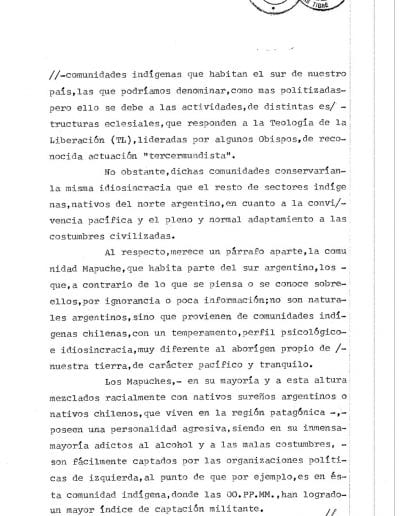 Una mención aparte merece la apreciación que hacen de los mapuches. Primero, la DIPPBA remarca que no son naturales de Argentina y sostiene que “en su inmensa mayoría adictos al alcohol y las malas costumbres, son fácilmente captados por las organizaciones políticas de izquierda”. Después llegan a afirmar que forman parte de un plan de expansión de la Nación chilena: “Su emigración desde Chile para participar de cualquier actividad que pueda crear desestabilización o caos, en el marco de la política geoestratégica y expansionista chilena”. Estos discursos parecen tener, aún hoy, una absoluta vigencia e incluso son utilizados bajo el paradigma de las “nuevas amenazas” para justificar todo tipo de acciones violentas para reprimir los reclamos de las comunidades mapuches.