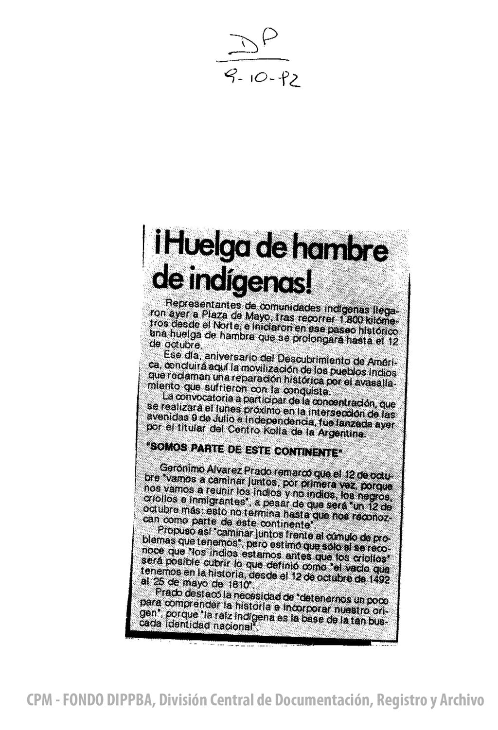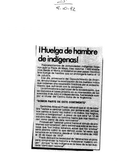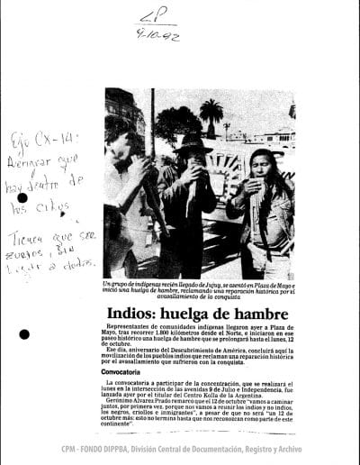 Otras de las actividades fue la peregrinación, desde los días previos al 12 de octubre, de comunidades del norte hacia Buenos Aires donde se realizaron los actos oficiales. La DIPPBA siguió ese recorrido y recabó la información que iba saliendo en los diarios nacionales. “Indios: huelga de hambre”, fue el título de una de las notas que fueron recortadas y sumadas a los legajos de la DIPPBA.