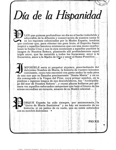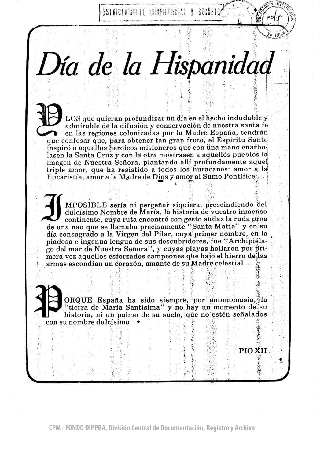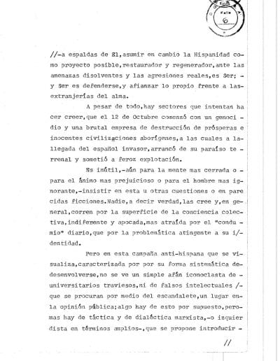 La preocupación por las actividades de repudio a la conquista no sólo se limitaron al espionaje sobre el supuesto “plan de operaciones subversivas” sino que esta persecución estuvo amparada por fundamentos teóricos e históricos: la hispanidad frente al cientificismo. Esa disputa dialéctica se reconstruye en un profundo análisis filosófico que cita a Maurras, evoca la plenitud del hombre alcanza en la edad media, reniega de la modernidad y valora la empresa evangelizadora.