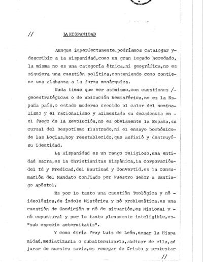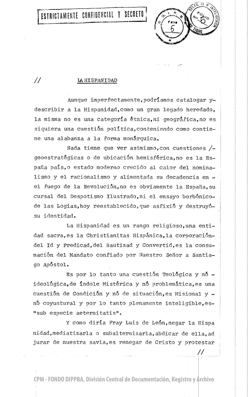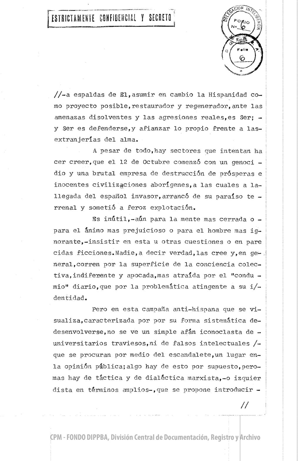 En este informe comienza bajo el modesto título “La hispanidad”, dice el intelectual de la DIPPBA que en la labor de los misioneros hispanos están las “formulaciones filosóficas y sustentos teóricos-históricos válidos para rebatir los argumentos y las posturas anti-católicas de la pseudo intelectualidad marxista”. Y aclara en otra parte: “Bajo la falsa síntesis de Opresor-Conquistador-Represor Vs Indígena-explotado-asalariado, nos intentan llevar a un enfrentamiento dialéctico […] En esta perspectiva, trataremos de ilustrarnos acerca de aquellas magníficas cualidades heredadas del espíritu español, y que han servido para edificar entre América Latina y nuestra Madre España, esa riquísima cultura de raigambre cristiana”.