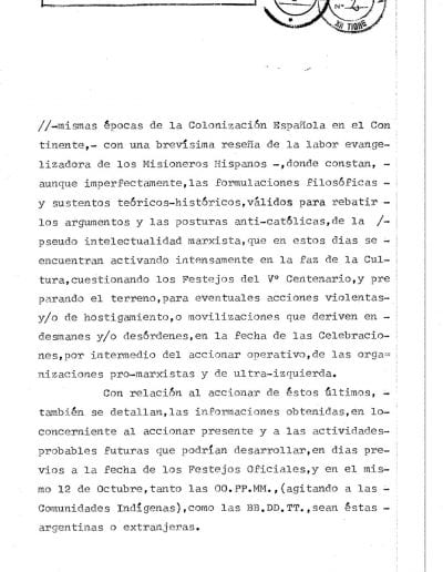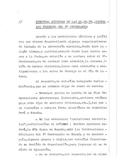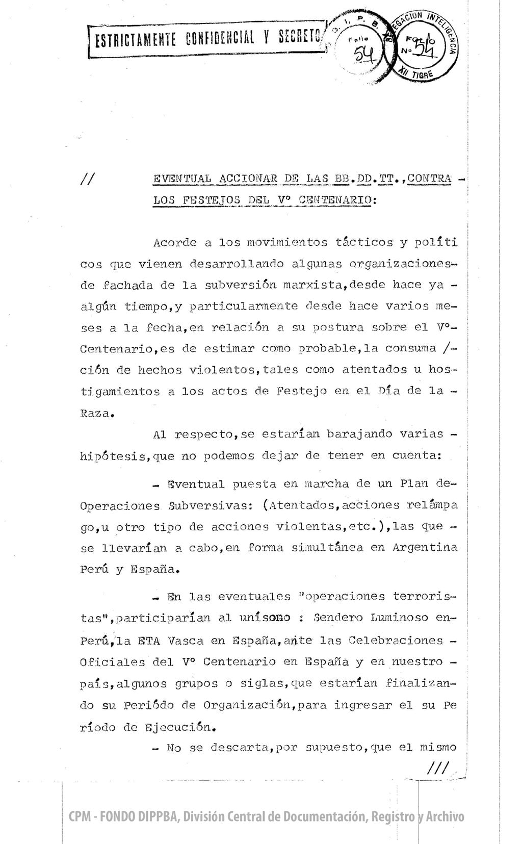 Estas hipótesis de conflicto se mencionan bajo el título de “Eventual accionar de las BB.DD.TT. contra los festejos del Vº centenario”, en donde la DIPPBA expone algunas alarmas que, a la luz de los hechos, resultan hilarante: que Sendero Luminoso ocupe Lima para impedir los festejos oficiales, por ejemplo. Las celebraciones de los Estados se vieron empañadas no por el accionar violento de organizaciones sino por una persistente y digna militancia que tenía dos pilares: la histórica resistencia de los pueblos originarios y la solidaridad de sectores sociales, políticos y eclesiásticos.