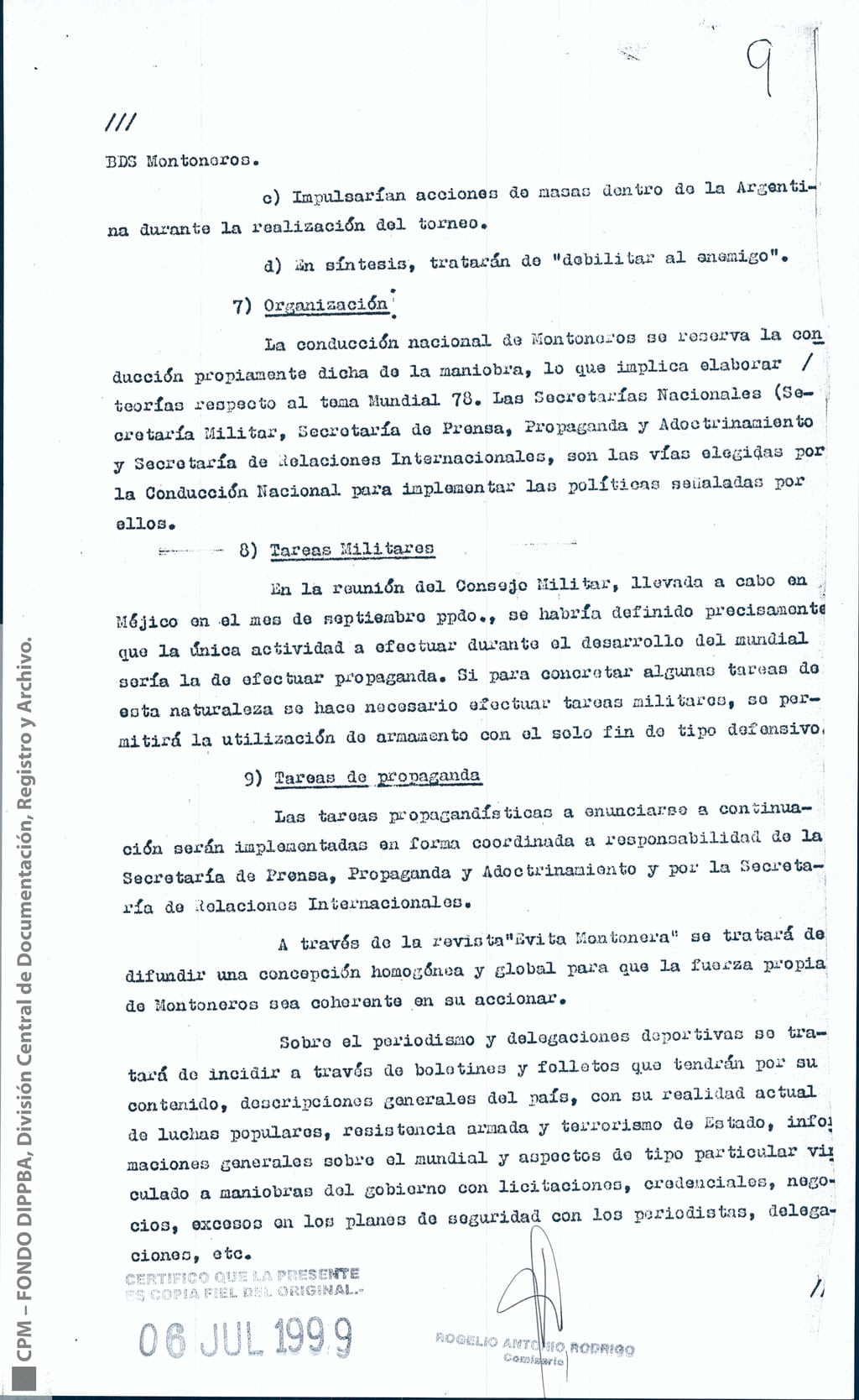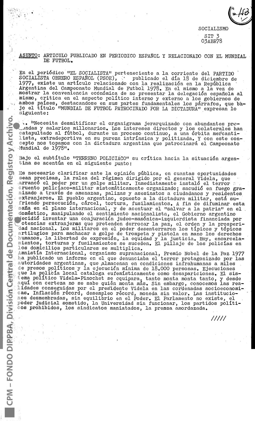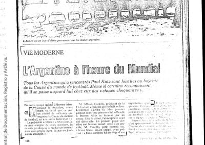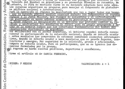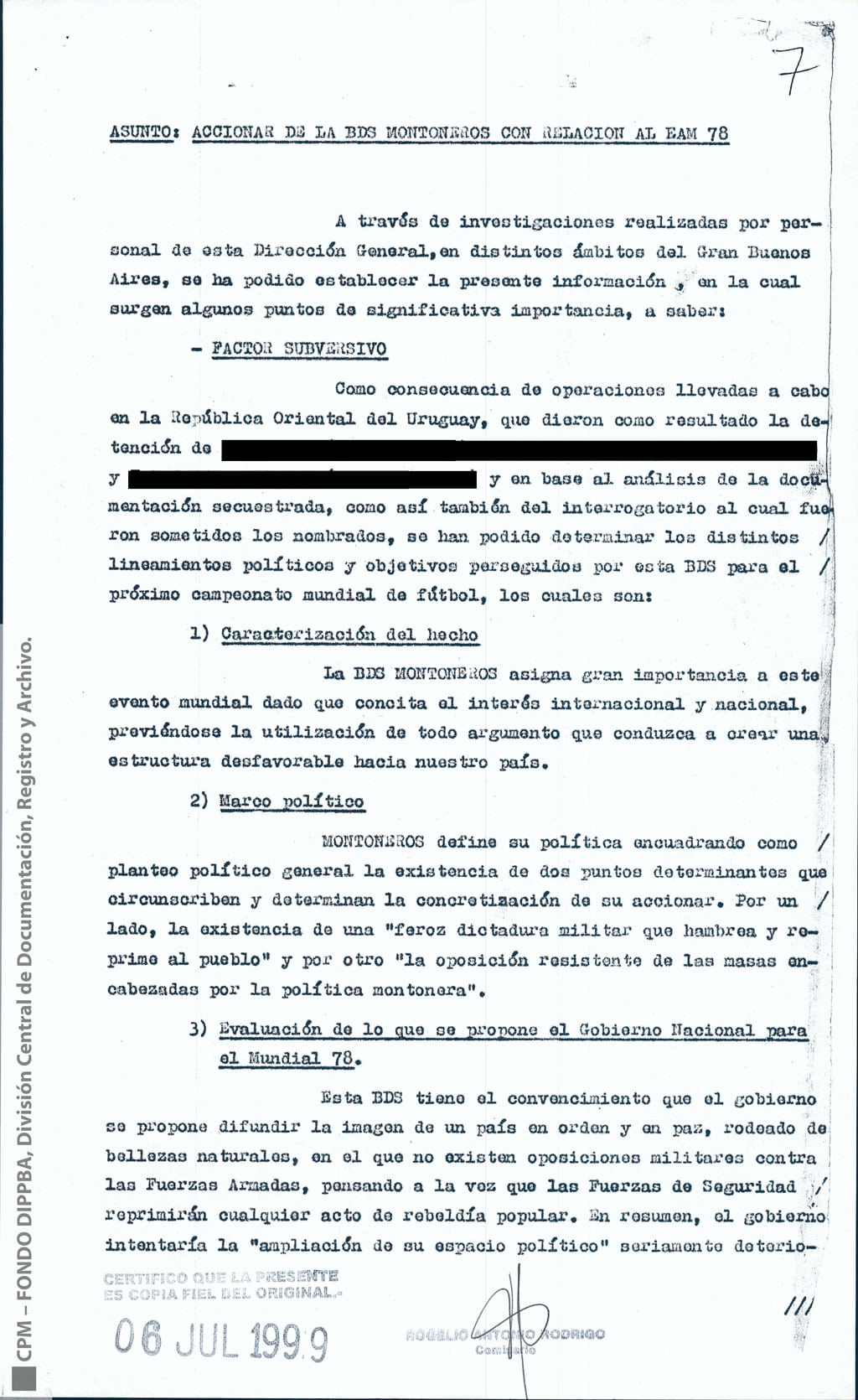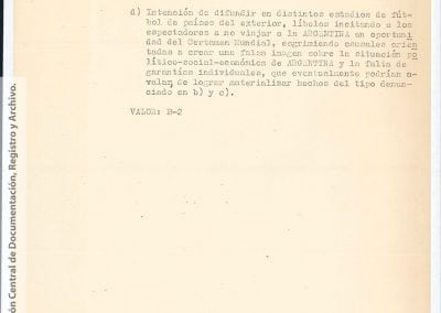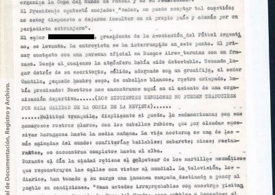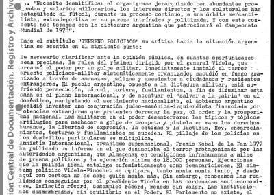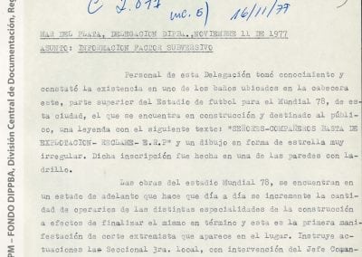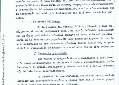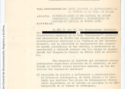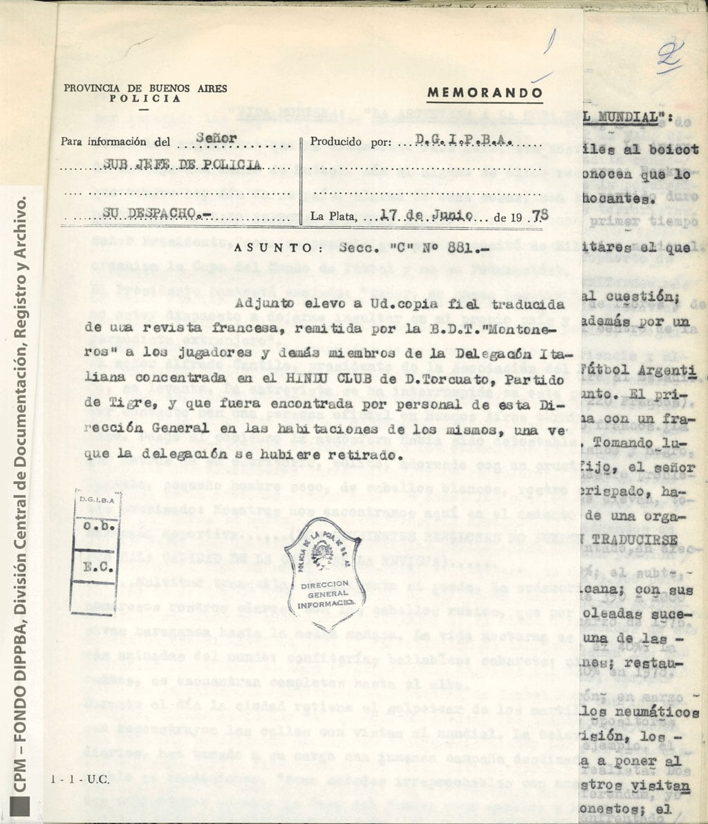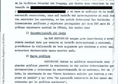 Esta información había sido recogida “como consecuencia de operaciones llevadas a cabo en la República Oriental del Uruguay, que dieron como resultado la detención de [miembro de Montoneros] y en base al análisis de documentación secuestrada”. Antes y durante el mundial de fútbol, y a partir de directivas emanadas de organismos de seguridad, la DIPPBA se encargó de producir y reunir información sobre posibles intentos de sabotear el mundial y sobre el contacto de los exiliados con la prensa internacional para difundir la denuncia de una “feroz dictadura militar que hambrea y reprime al pueblo”, según el análisis que los propios servicios de inteligencia realizan sobre el pensamiento de Montoneros.