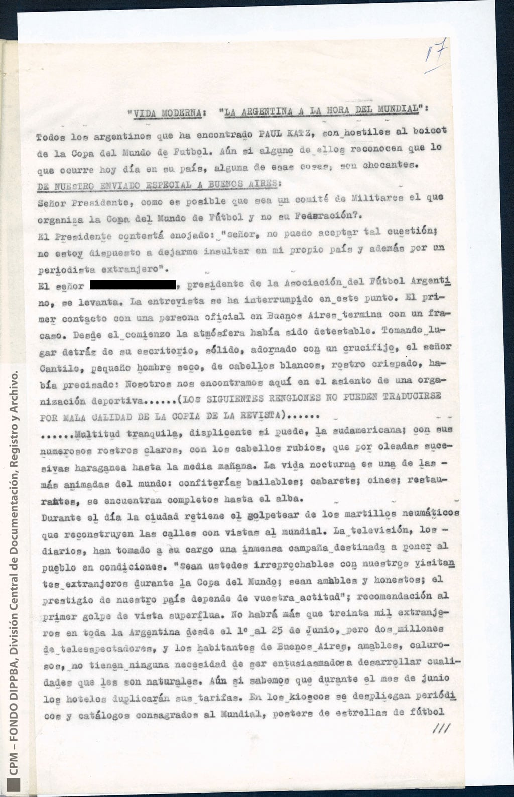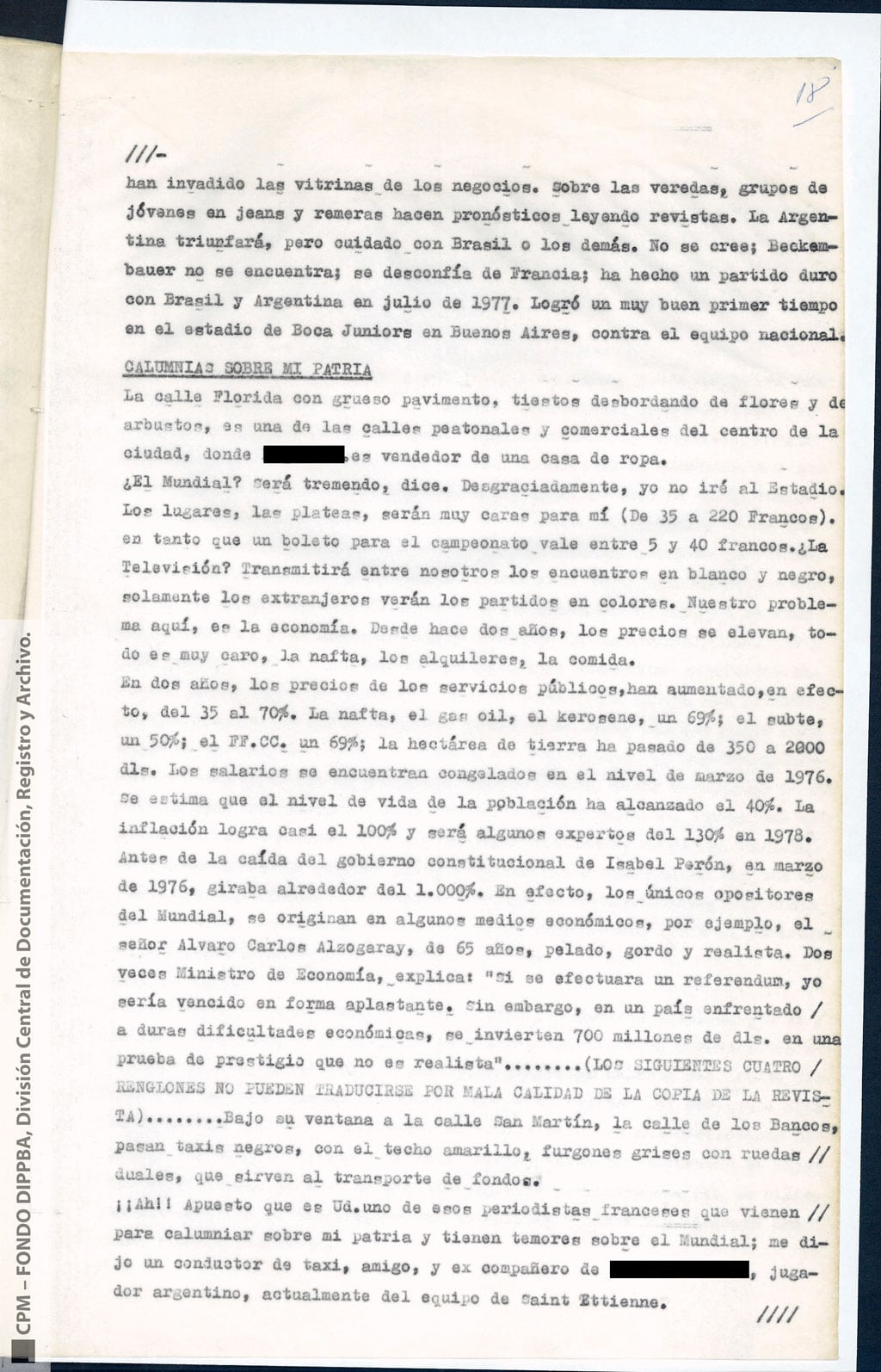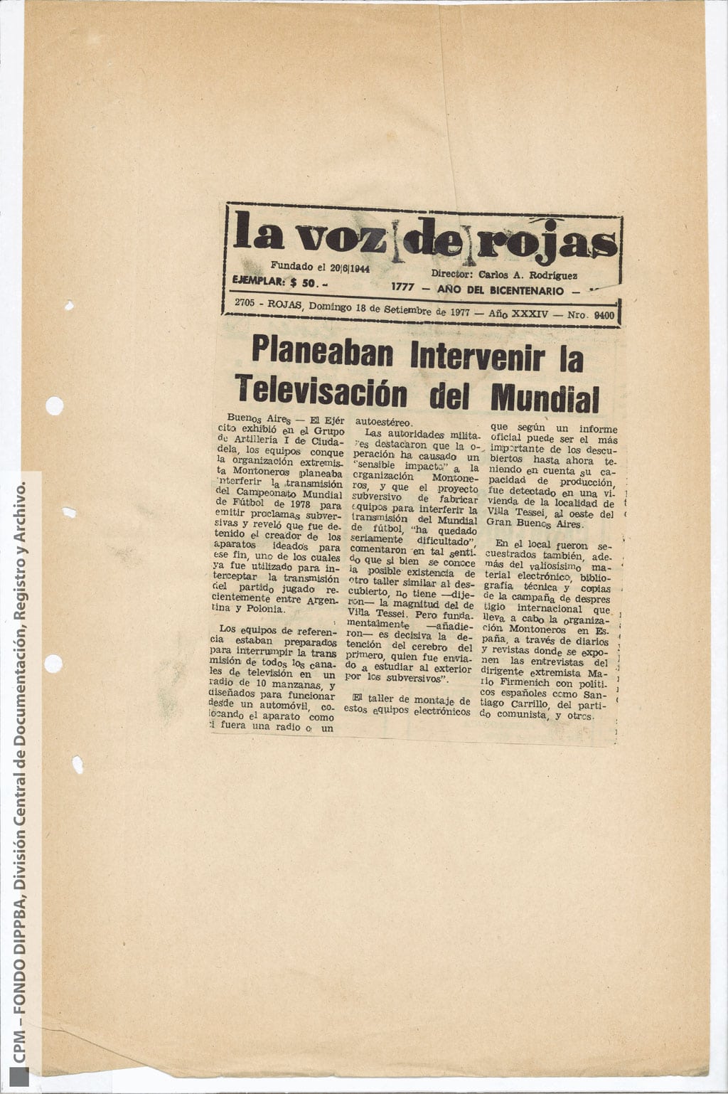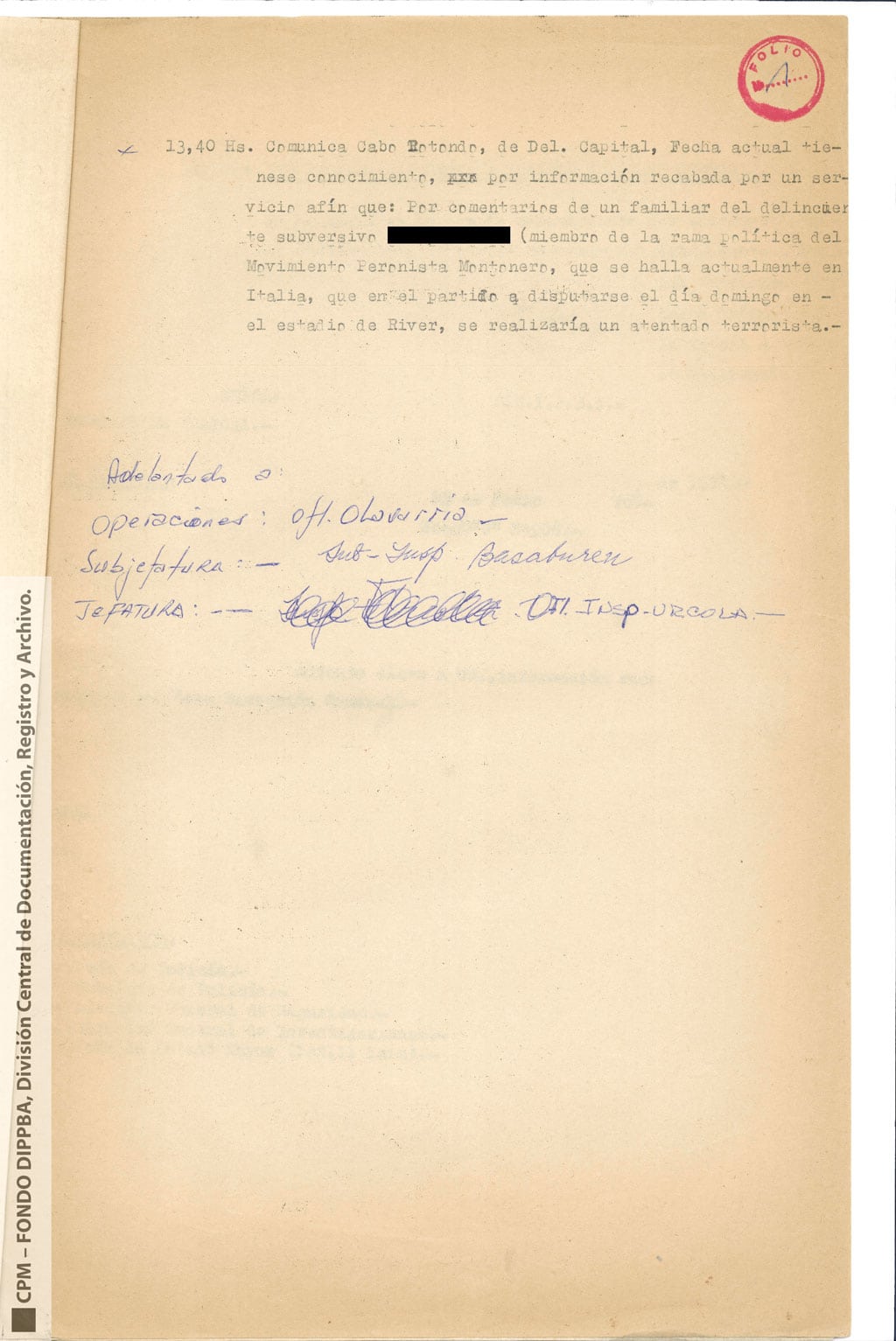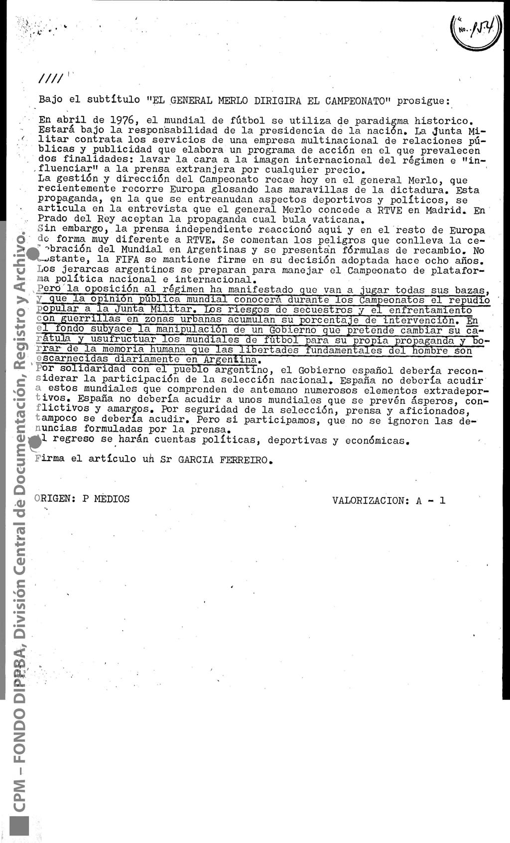 Esta información había sido recogida “como consecuencia de operaciones llevadas a cabo en la República Oriental del Uruguay, que dieron como resultado la detención de [miembro de Montoneros] y en base al análisis de documentación secuestrada”. Antes y durante el mundial de fútbol, y a partir de directivas emanadas de organismos de seguridad, la DIPPBA se encargó de producir y reunir información sobre posibles intentos de sabotear el mundial y sobre el contacto de los exiliados con la prensa internacional para difundir la denuncia de una “feroz dictadura militar que hambrea y reprime al pueblo”, según el análisis que los propios servicios de inteligencia realizan sobre el pensamiento de Montoneros.