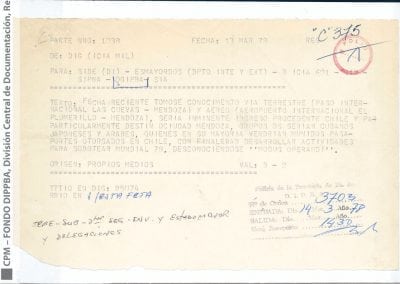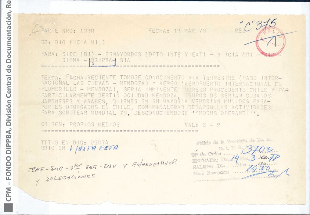 Los agentes de inteligencia también manifestaron su preocupación por el arribo de saboteadores extranjeros, por el rumor de un posible atentado durante la final de la Copa del Mundo. El parte 1038 decía: “Fecha reciente tomóse conocimiento vía terrestre (paso internacional Las Cuevas – Mendoza) y aéreo (Aeropuerto internacional El Plumerillo – Mendoza), sería inminente ingreso provenientes de Chile y particularmente destino Mendoza, grupos DS serían cubanos, japoneses y árabes, quienes en su mayoría vendrían munidos pasaportes otorgados en Chile, con finalidad de desarrollar actividades para sabotear Mundial 78, desconociéndose ‘modus operandi’”. El informe circuló entre los distintos organismos de seguridad que conformaban la comunidad informativa (SIDE, Batallón 601, SIN, SIPNA, SIA) durante las semanas previas a la ceremonia de inauguración y, a pesar de lo extraño que parece, tenía una alta valoración como información con origen en propios medios y normalmente confiable y muy probable (B-2).