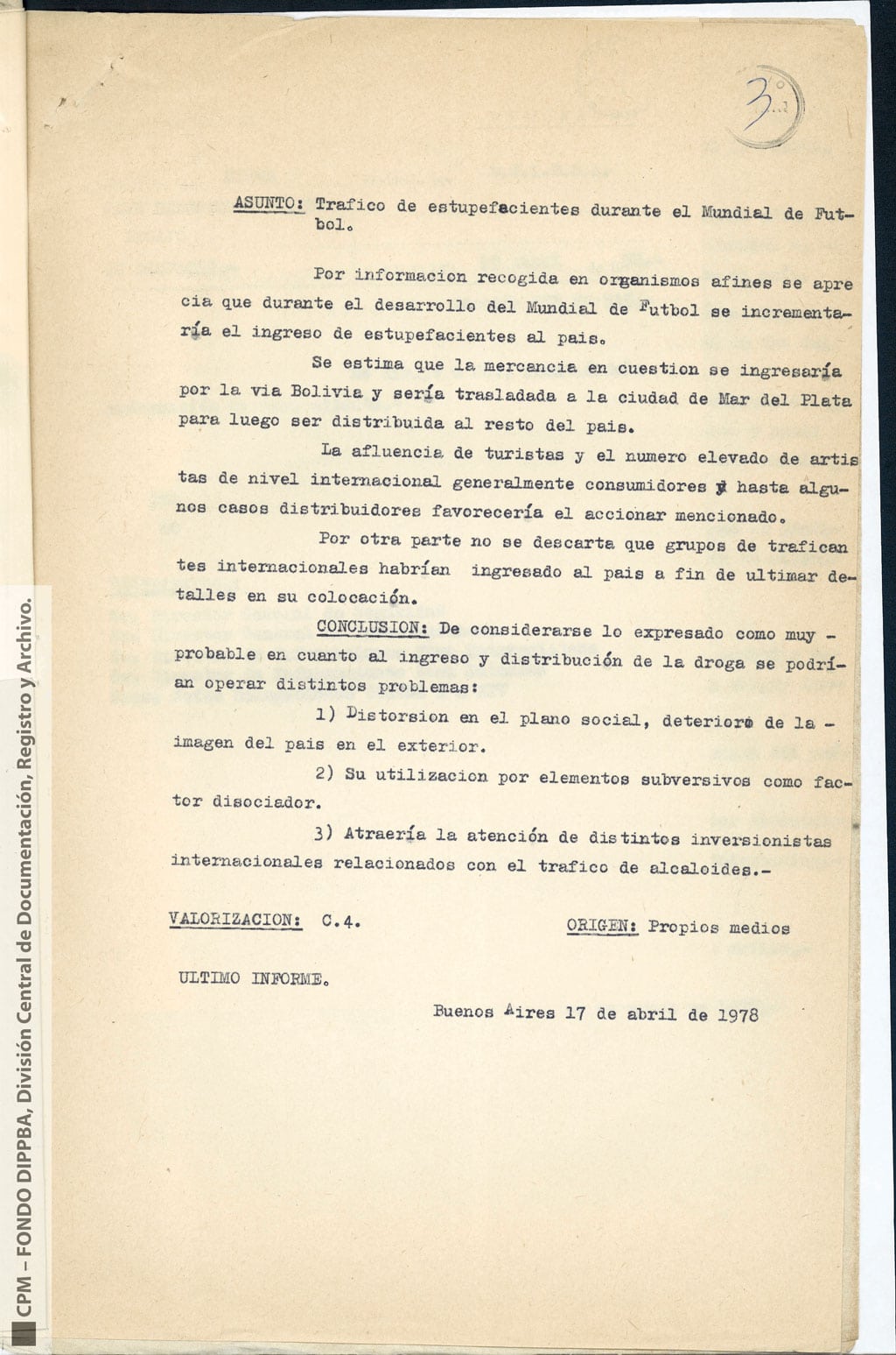 De la información elaborada en el marco del Mundial, quedan documentos de inteligencia que dan cuenta de investigaciones o reportes que no sólo no se cumplieron sino que, mirados a la distancia, resultan casi alucinantes. Entre ellos, se anuncia la preocupación por el aumento del tráfico y consumo de drogas como consecuencia de la llegada al país de personalidades “generalmente consumidores” y “distribuidores”, así consta en el legajo del 17 de abril de 1978 –40 días antes del comienzo del Mundial–. En la misma hoja se advierte que el tráfico de estupefacientes podría operar distintos problemas como “Distorsión en el plano social y deterioro de la imagen del país en el exterior, su utilización por elementos subversivos como factor disociador y atraería la atención de distintos inversionistas internacionales relacionados con el tráfico de alcaloides”.